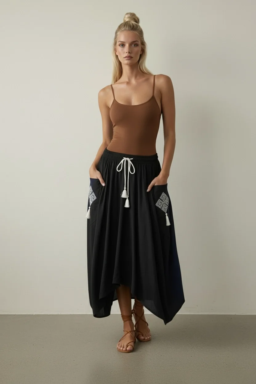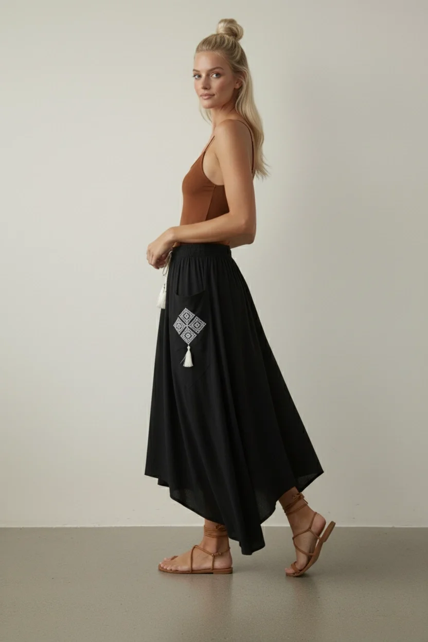 Lacivert Etnik Desenli Viskon Uzun Etek – Doğallığın ve Şıklığın Buluşması