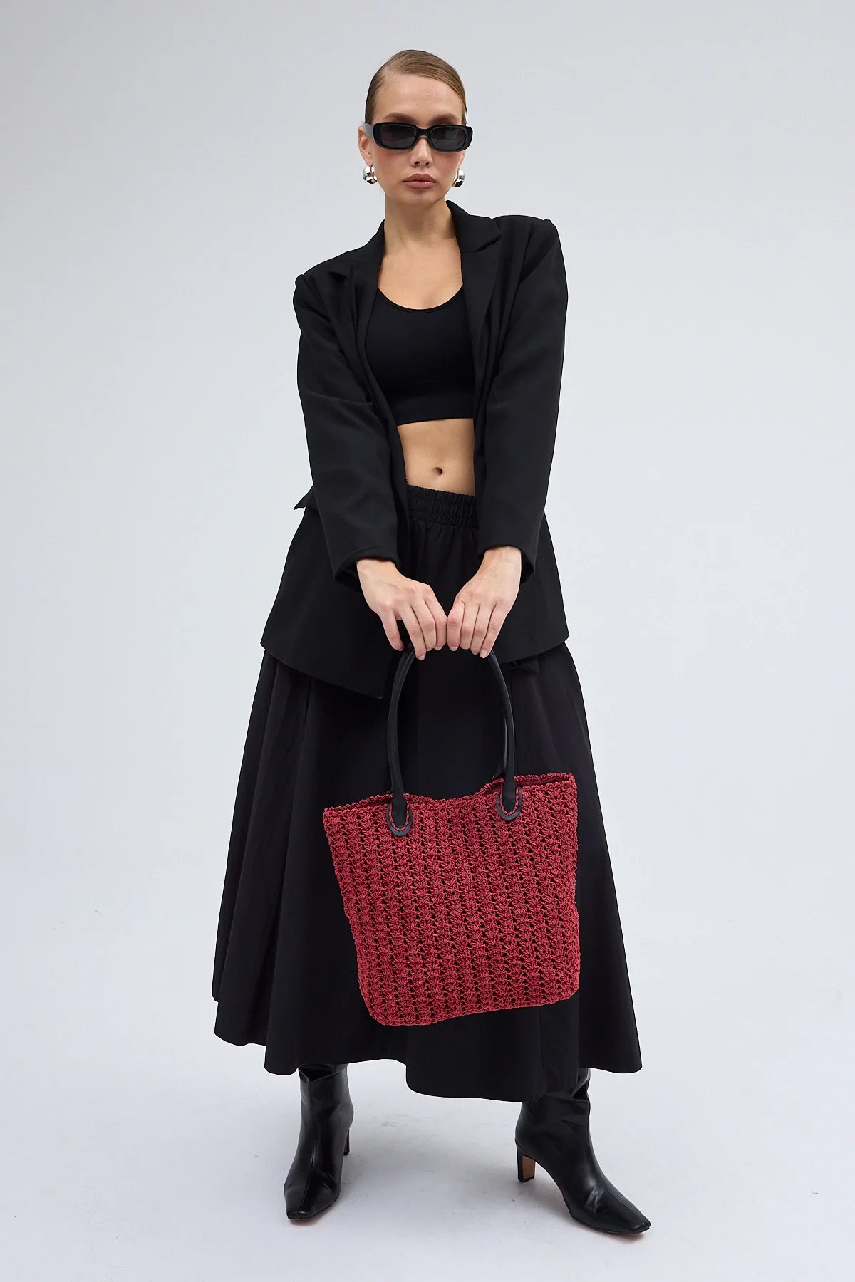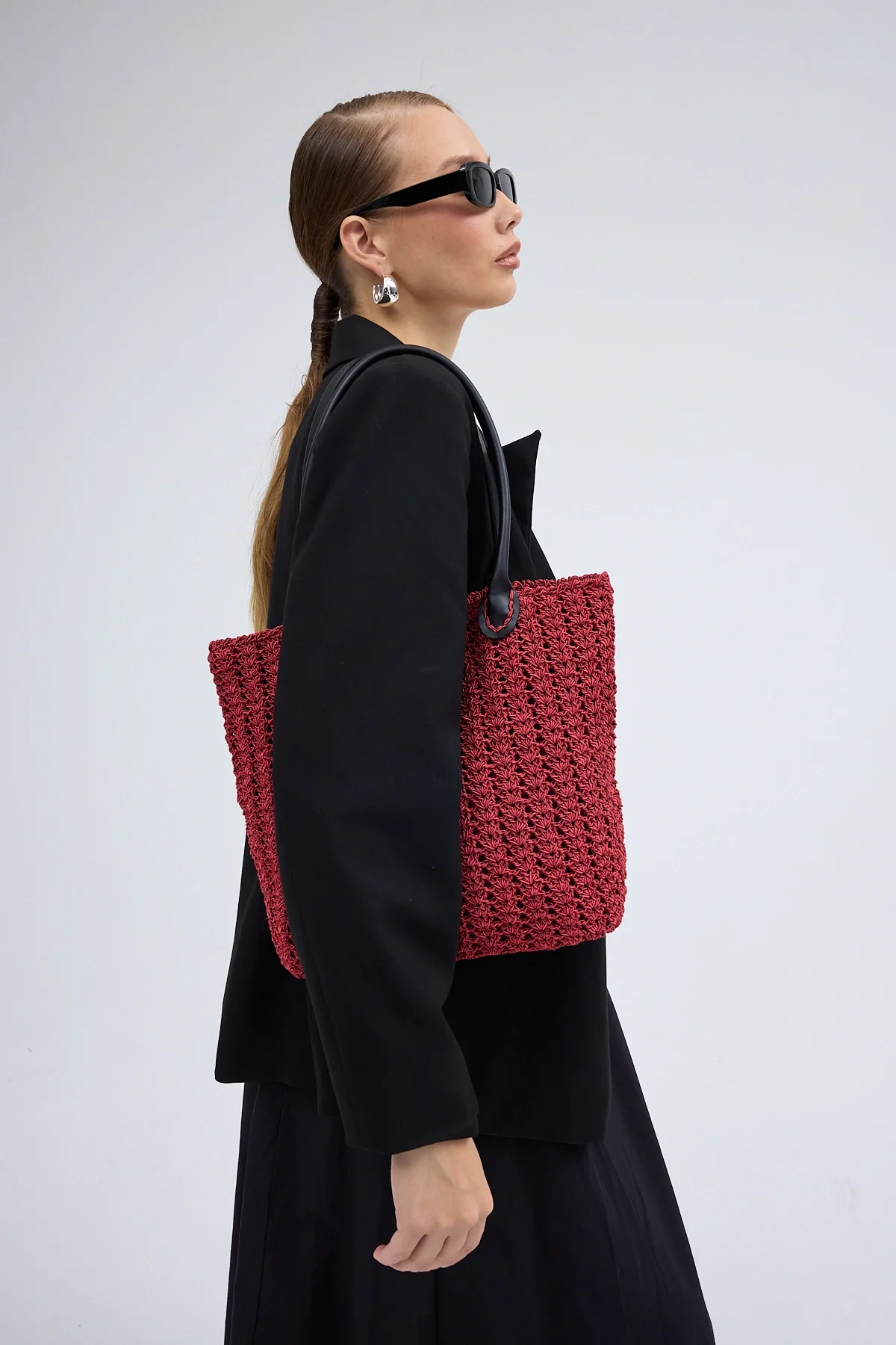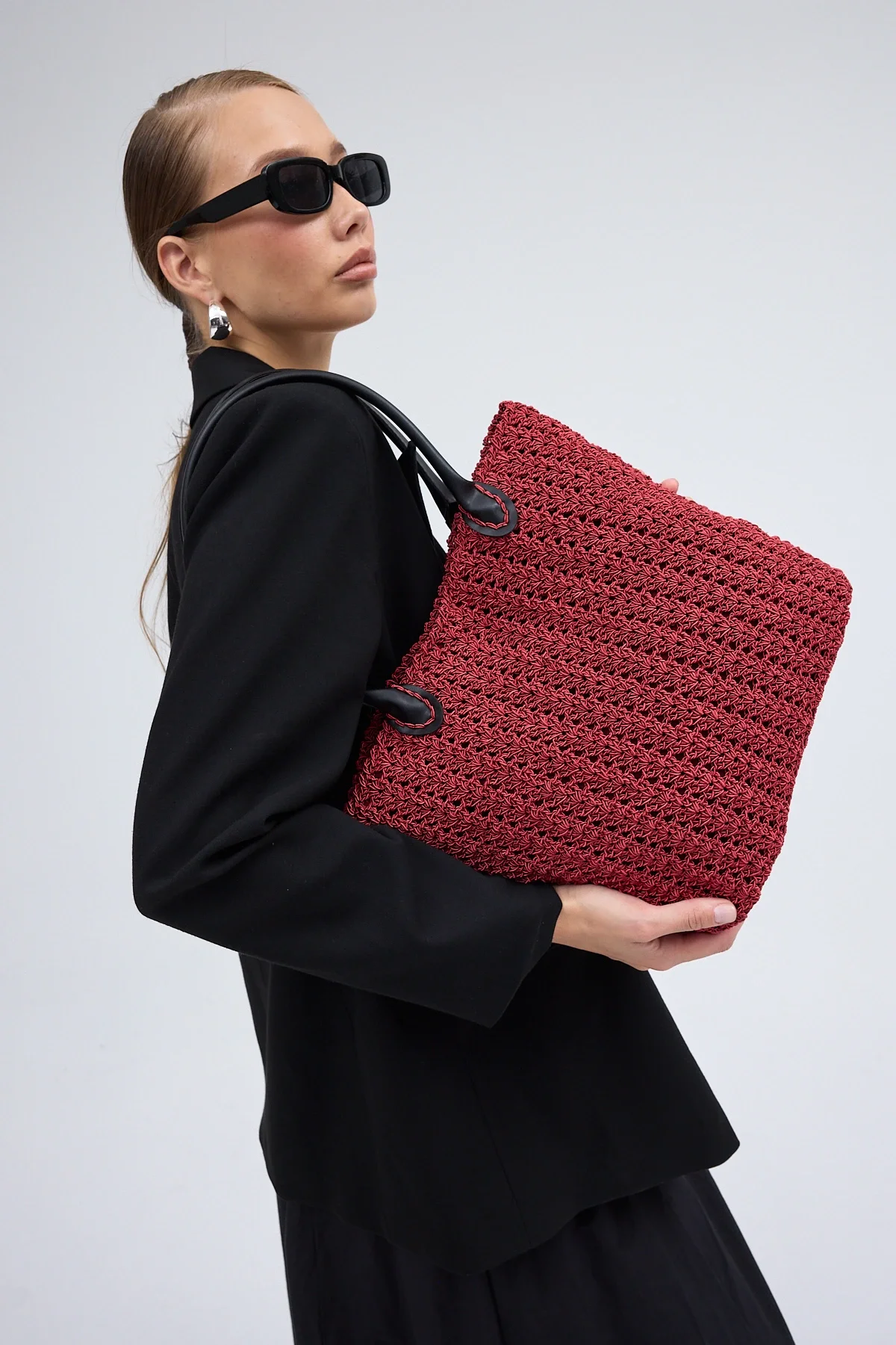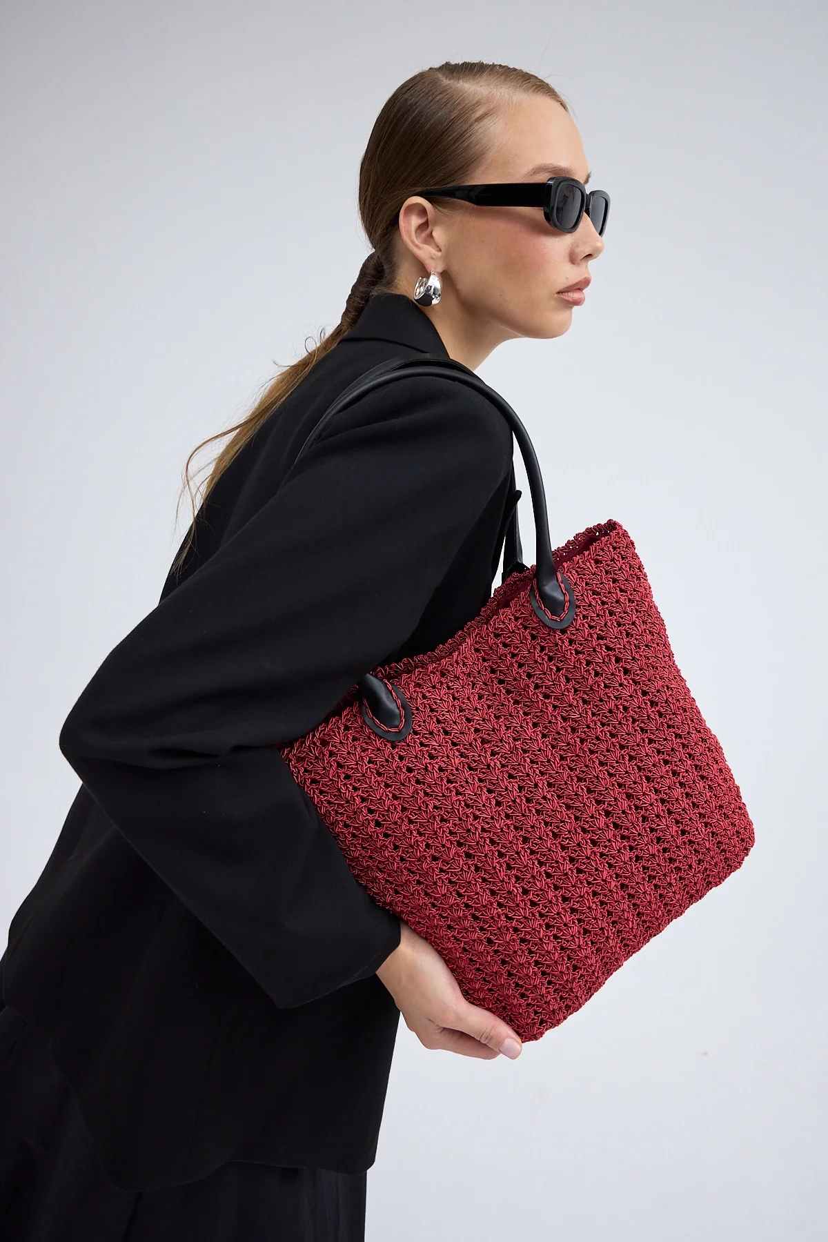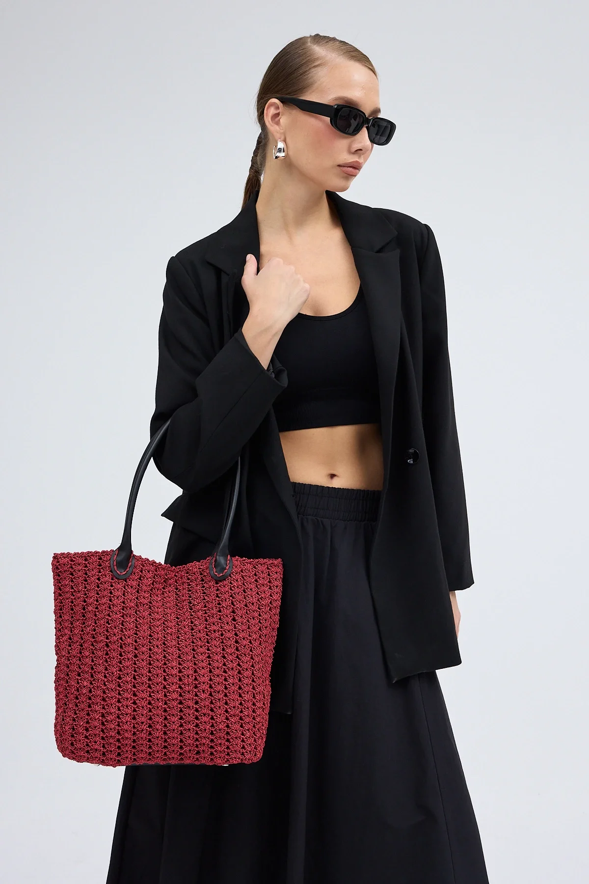 El yapımı Astarlı Hasır Çanta Bordo Siyah