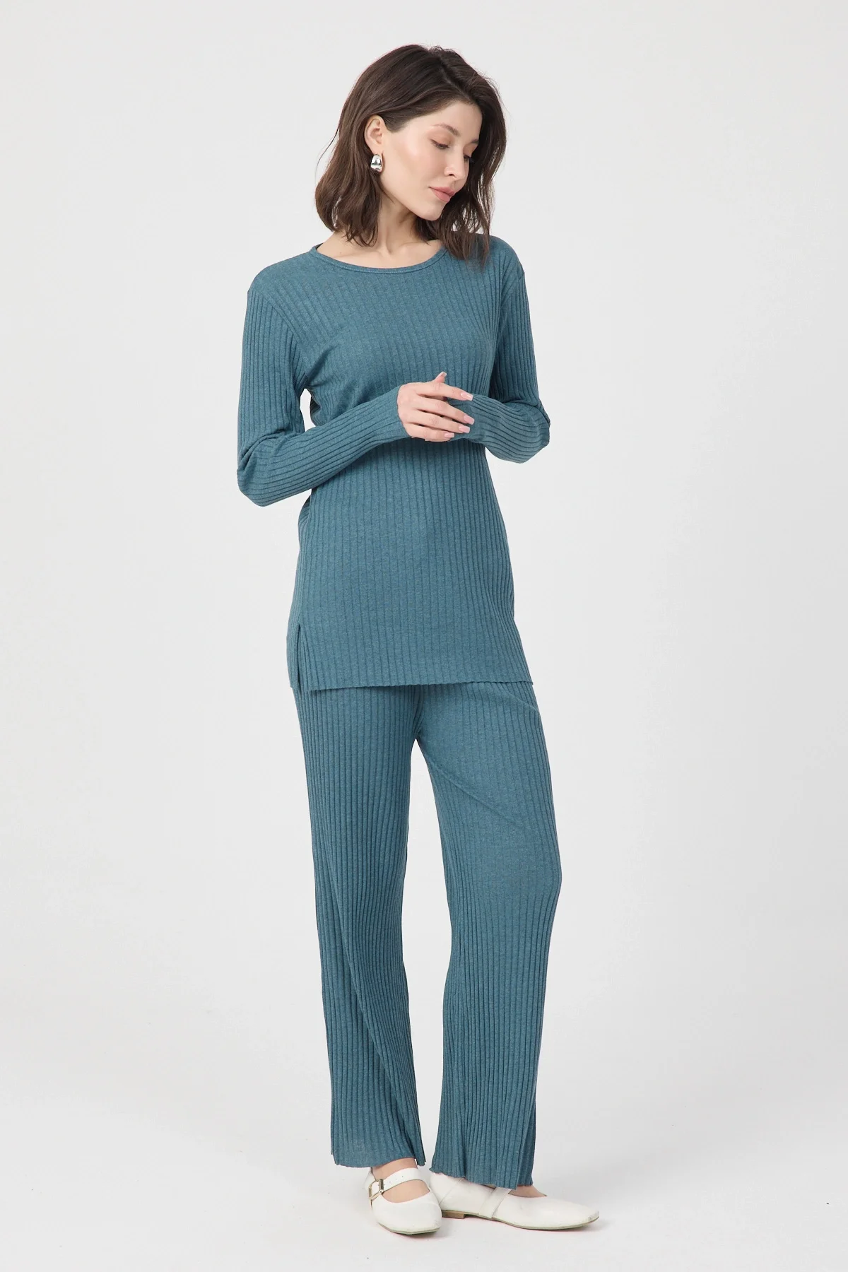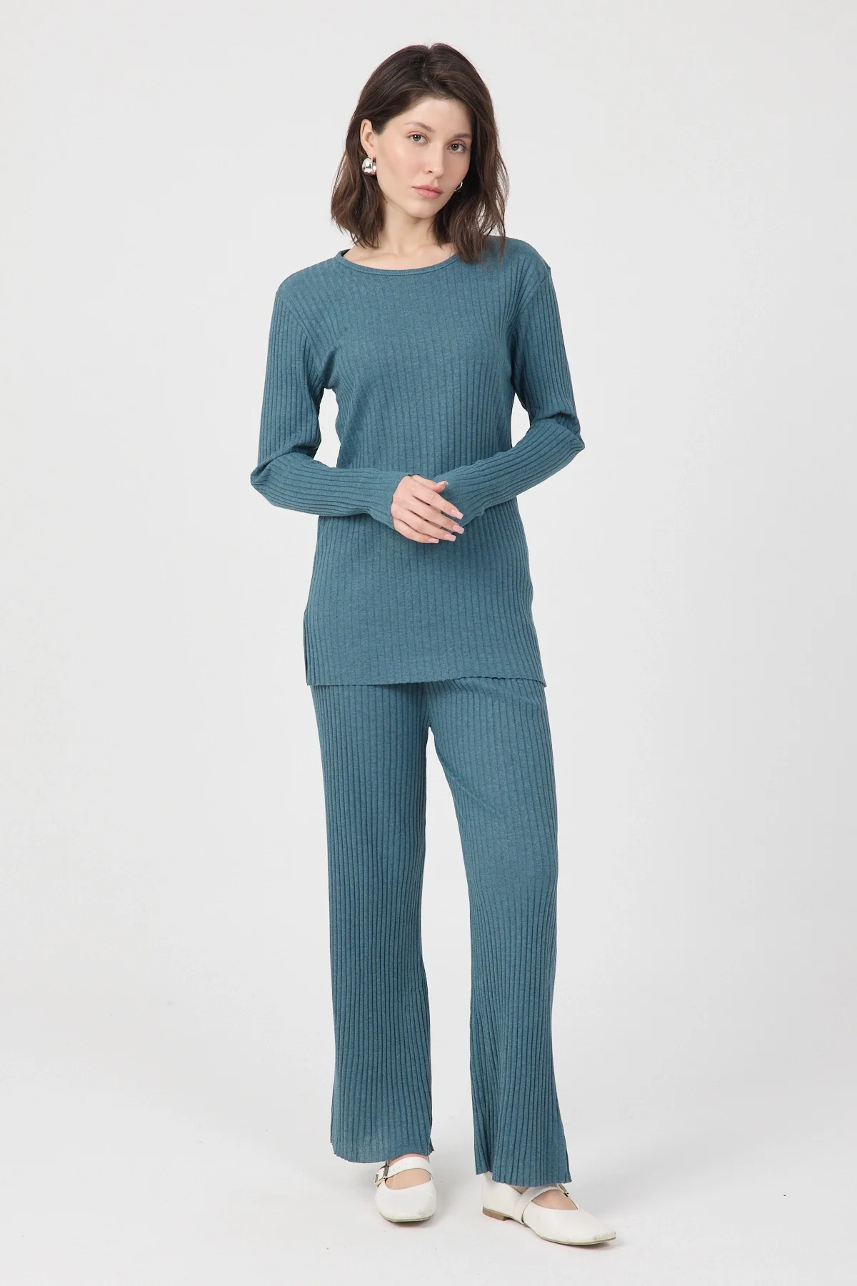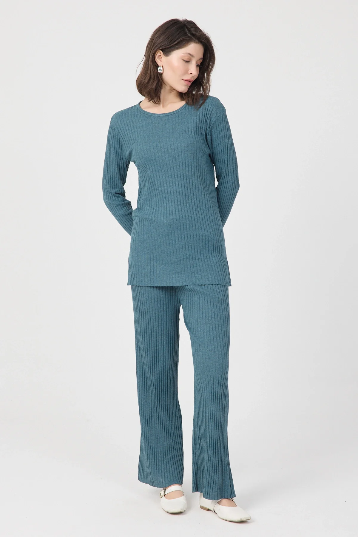 Rahat ve şık bir uyku deneyimi için tasarlanmış, %100 pamuk materyalden üretilmiş uzun kollu fitilli kiremit pijama takımı.