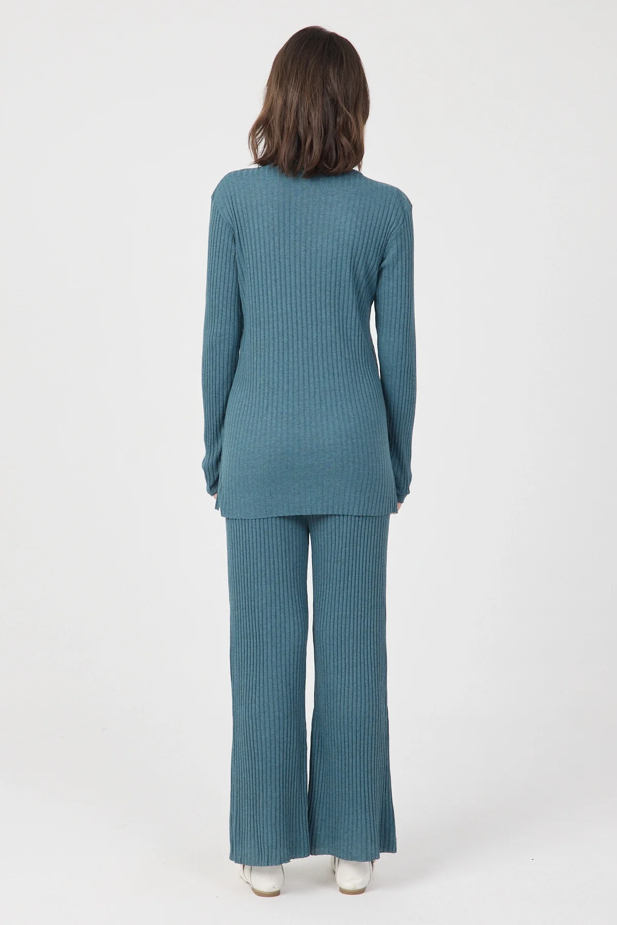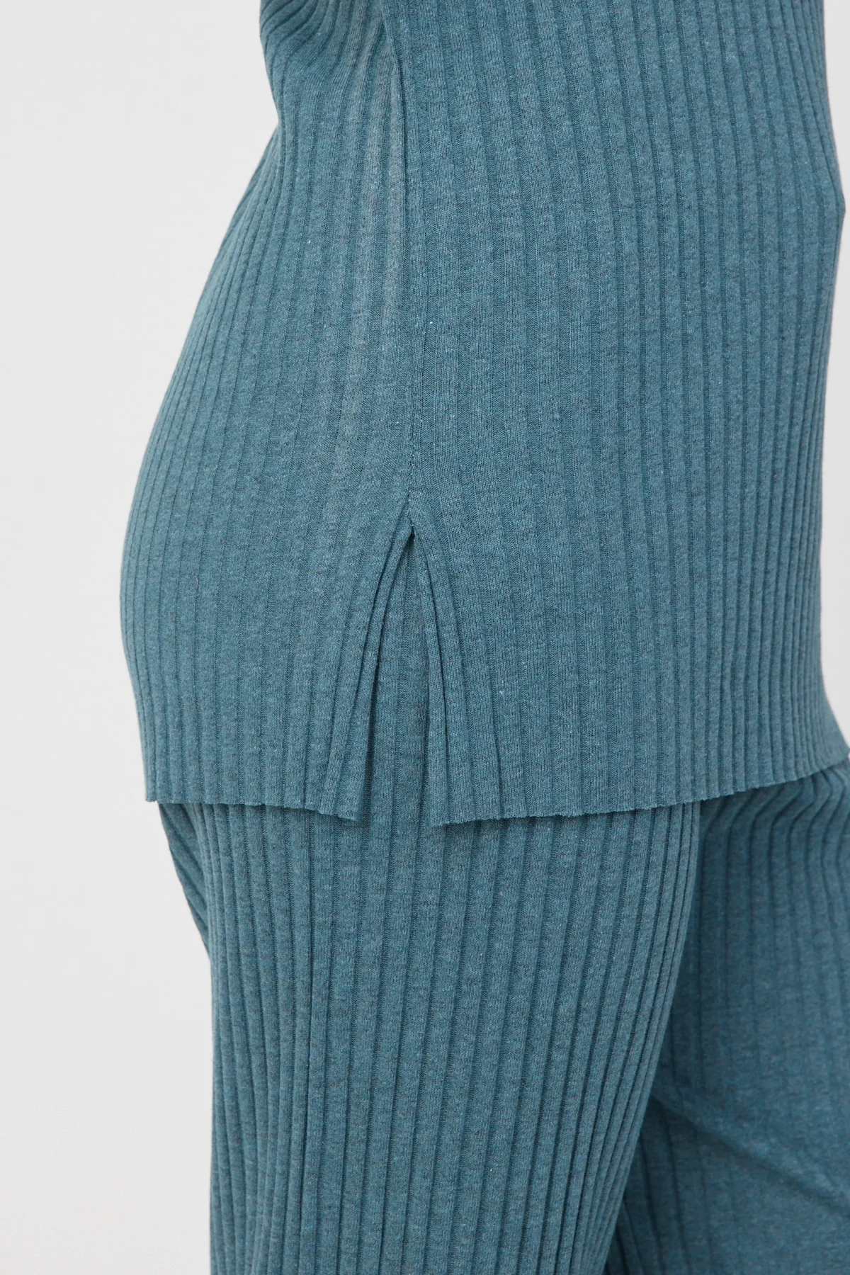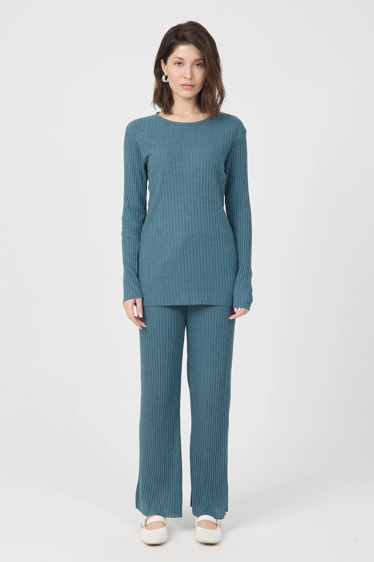 Rahat ve şık bir uyku deneyimi için tasarlanmış, %100 pamuk materyalden üretilmiş uzun kollu fitilli kiremit pijama takımı.