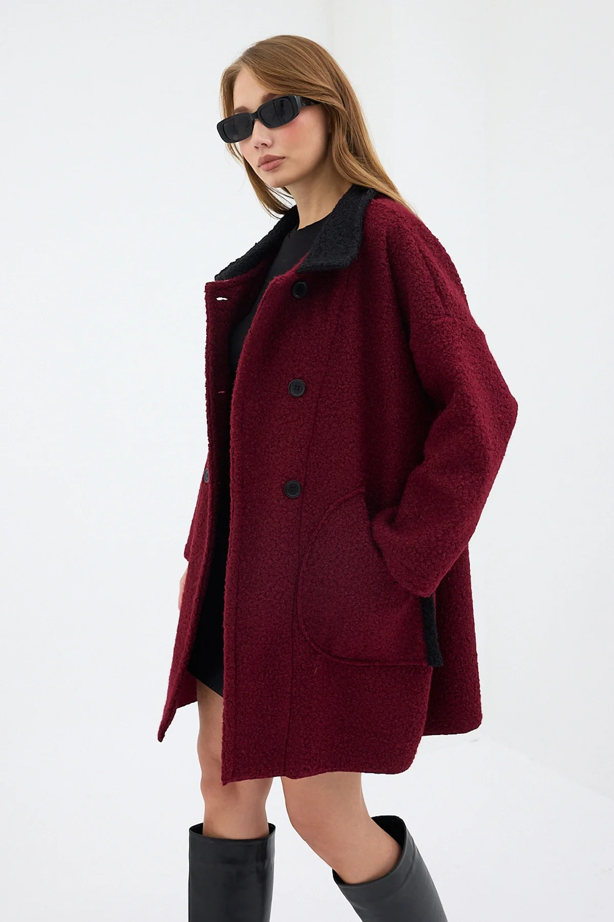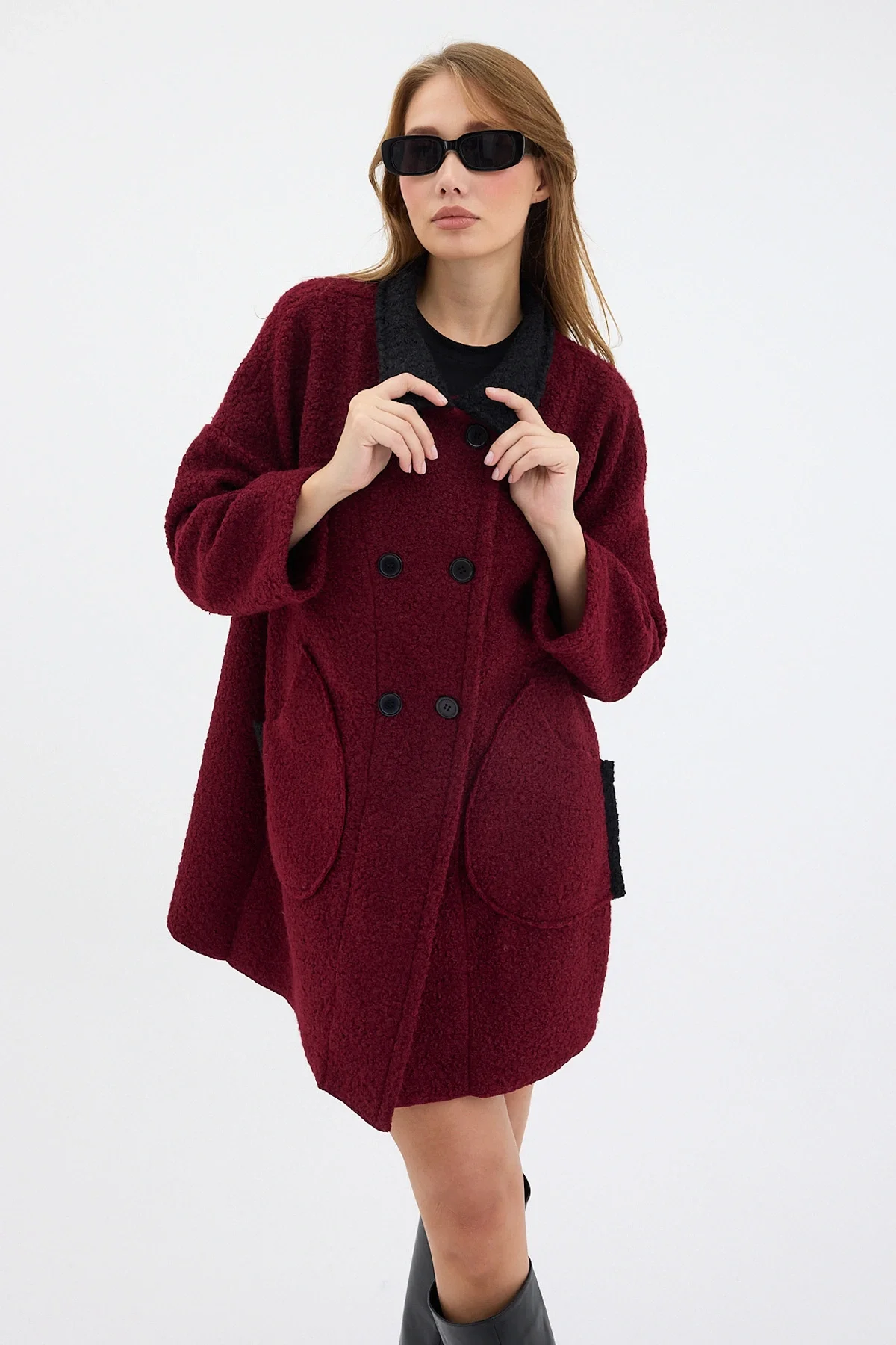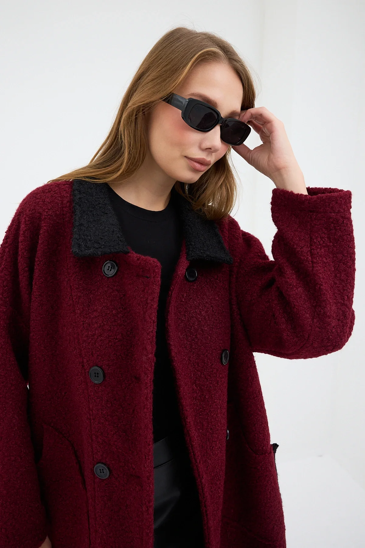 Yumuşacık buklet kumaştan üretilmiş bu oversize kaban, kontrast siyah yakası ve çift düğmeli tasarımıyla modern bir görünüm sunar. Geniş cepleri sayesinde hem kullanışlı hem de stil sahibi. Jean, bot veya çizme kombinleriyle mükemmel uyum sağlar. Soğuk havalarda sizi sıcacık tutarken tarzınızı da ön plana çıkarır.