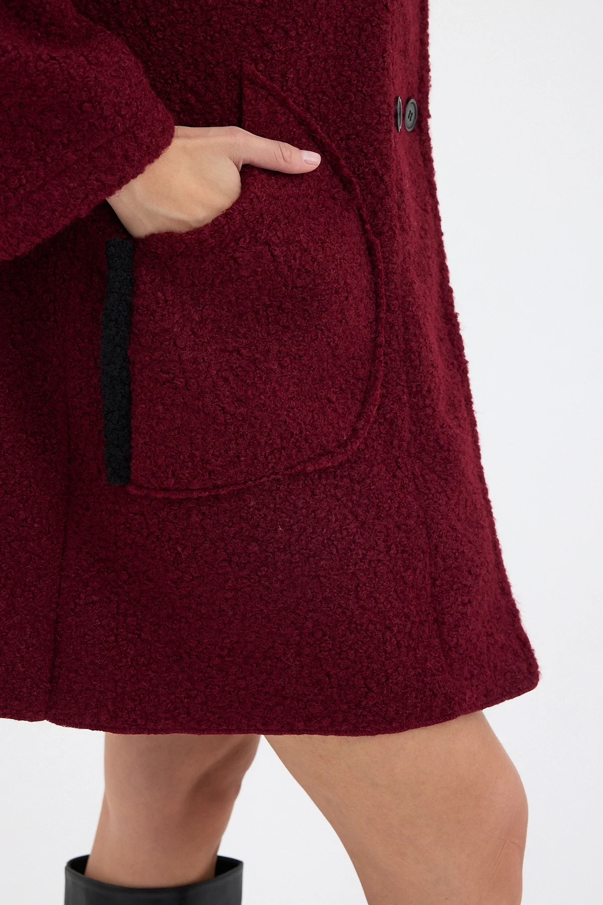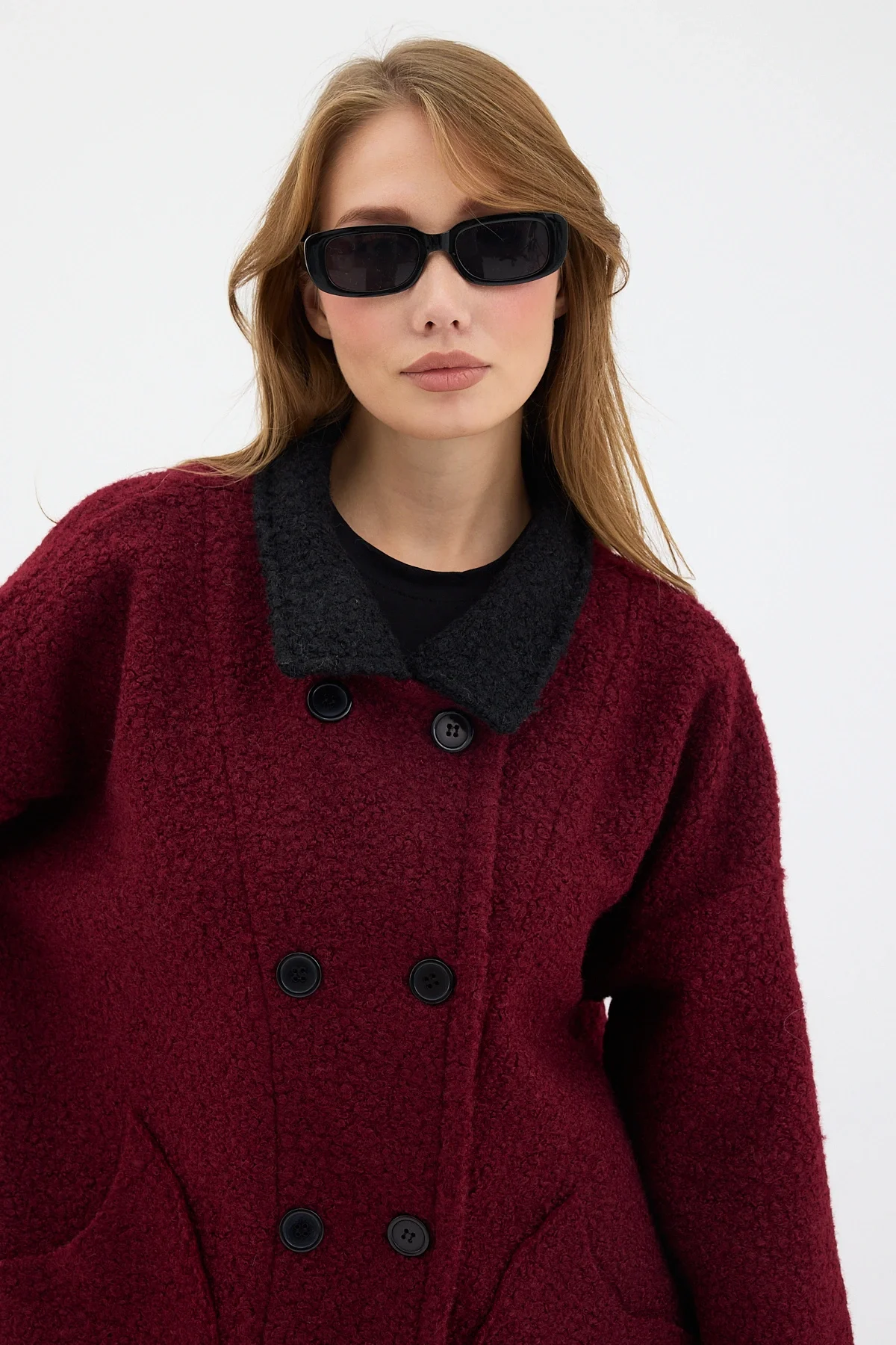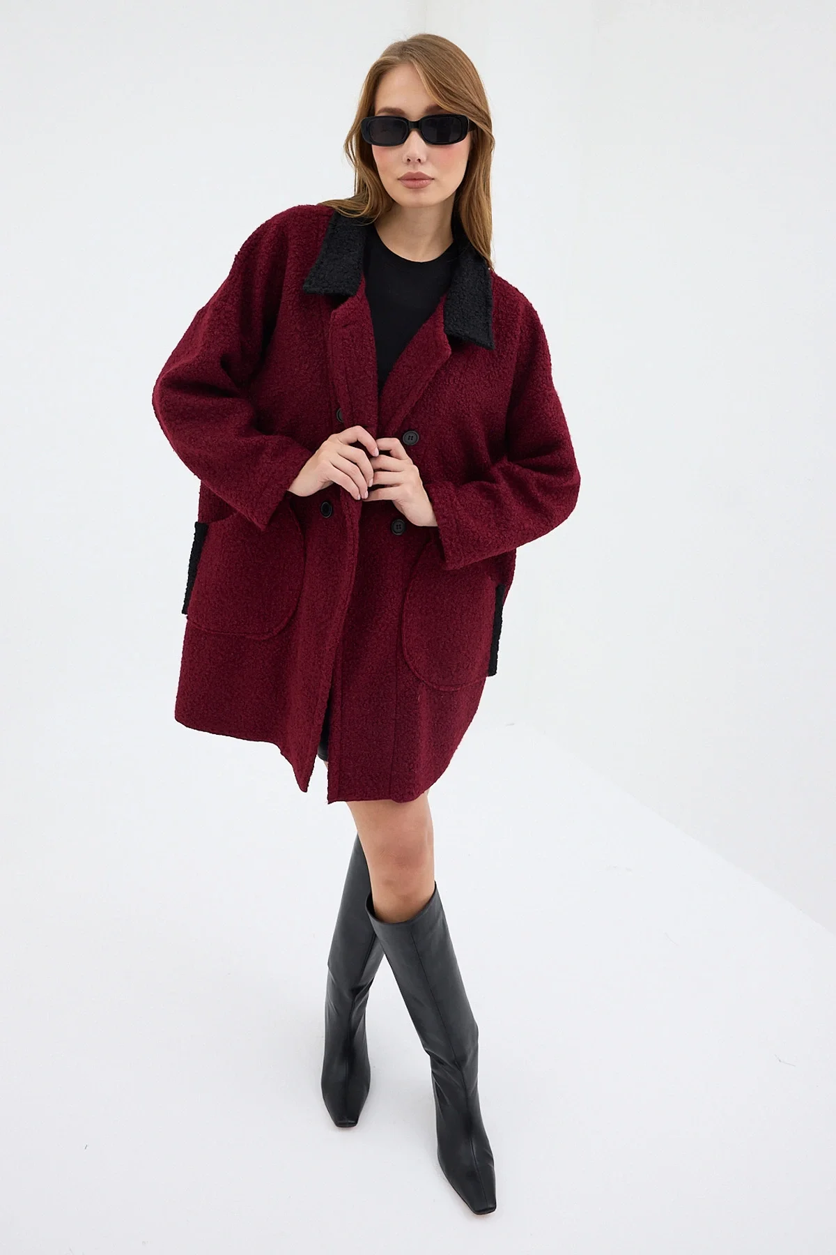 Yumuşacık buklet kumaştan üretilmiş bu oversize kaban, kontrast siyah yakası ve çift düğmeli tasarımıyla modern bir görünüm sunar. Geniş cepleri sayesinde hem kullanışlı hem de stil sahibi. Jean, bot veya çizme kombinleriyle mükemmel uyum sağlar. Soğuk havalarda sizi sıcacık tutarken tarzınızı da ön plana çıkarır.