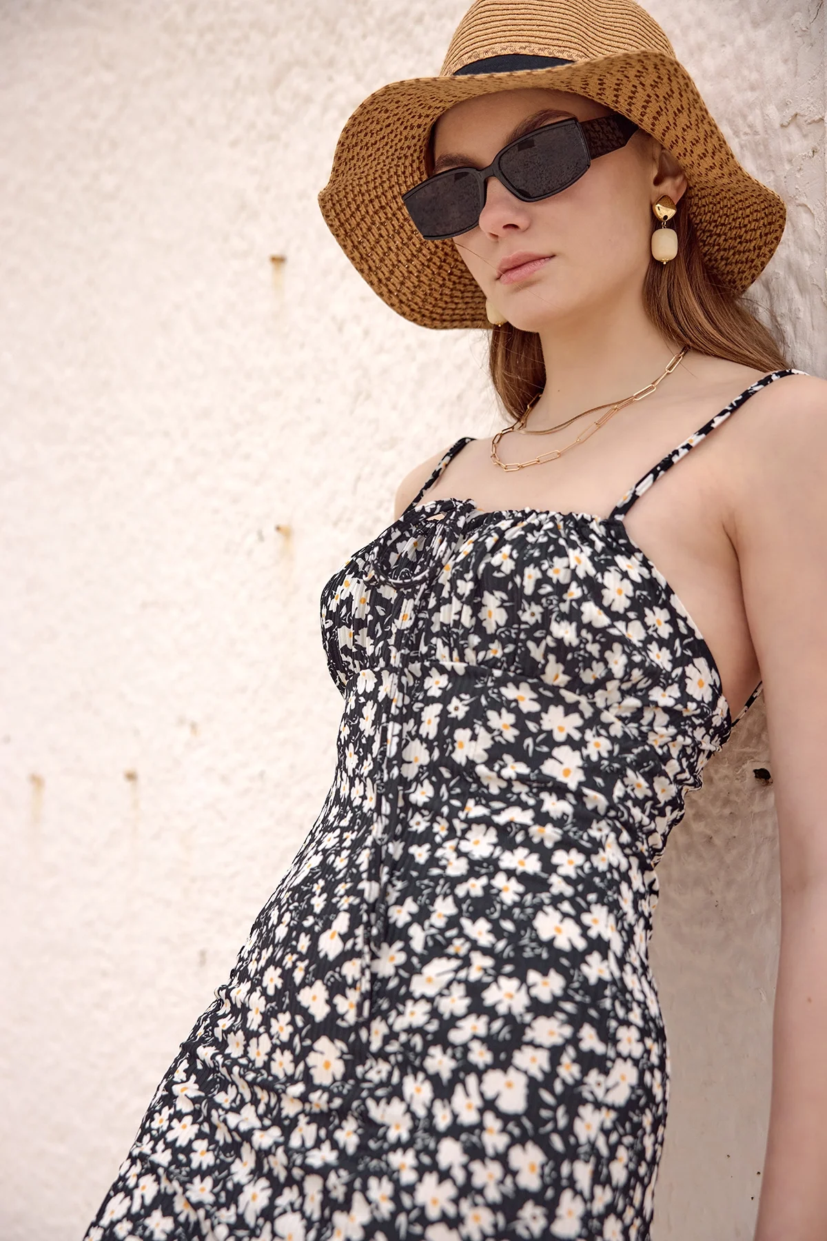 Siyah çiçek desenli yazlık elbiseyi topuklu bir terlik ya da spor ayakkabı ile kombinleyerek taze bir görüntü yakalayabilirsin.