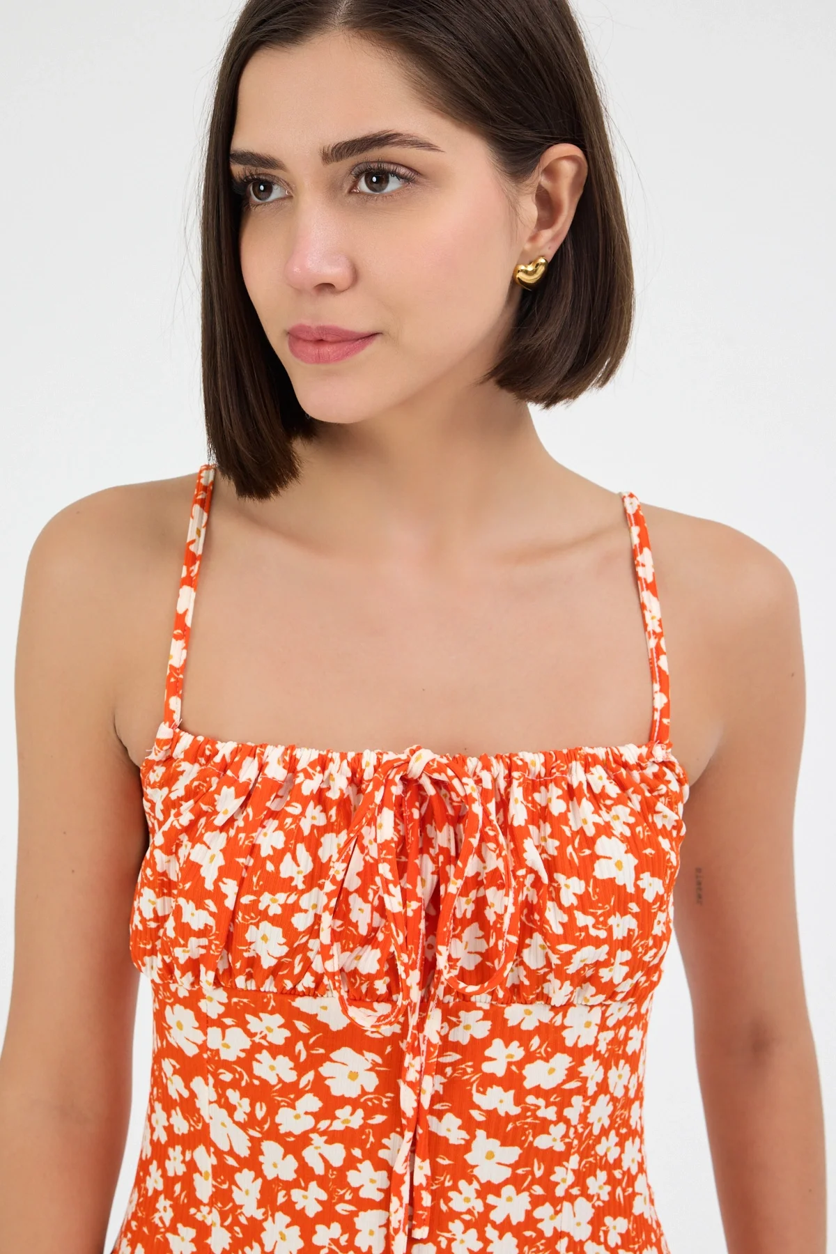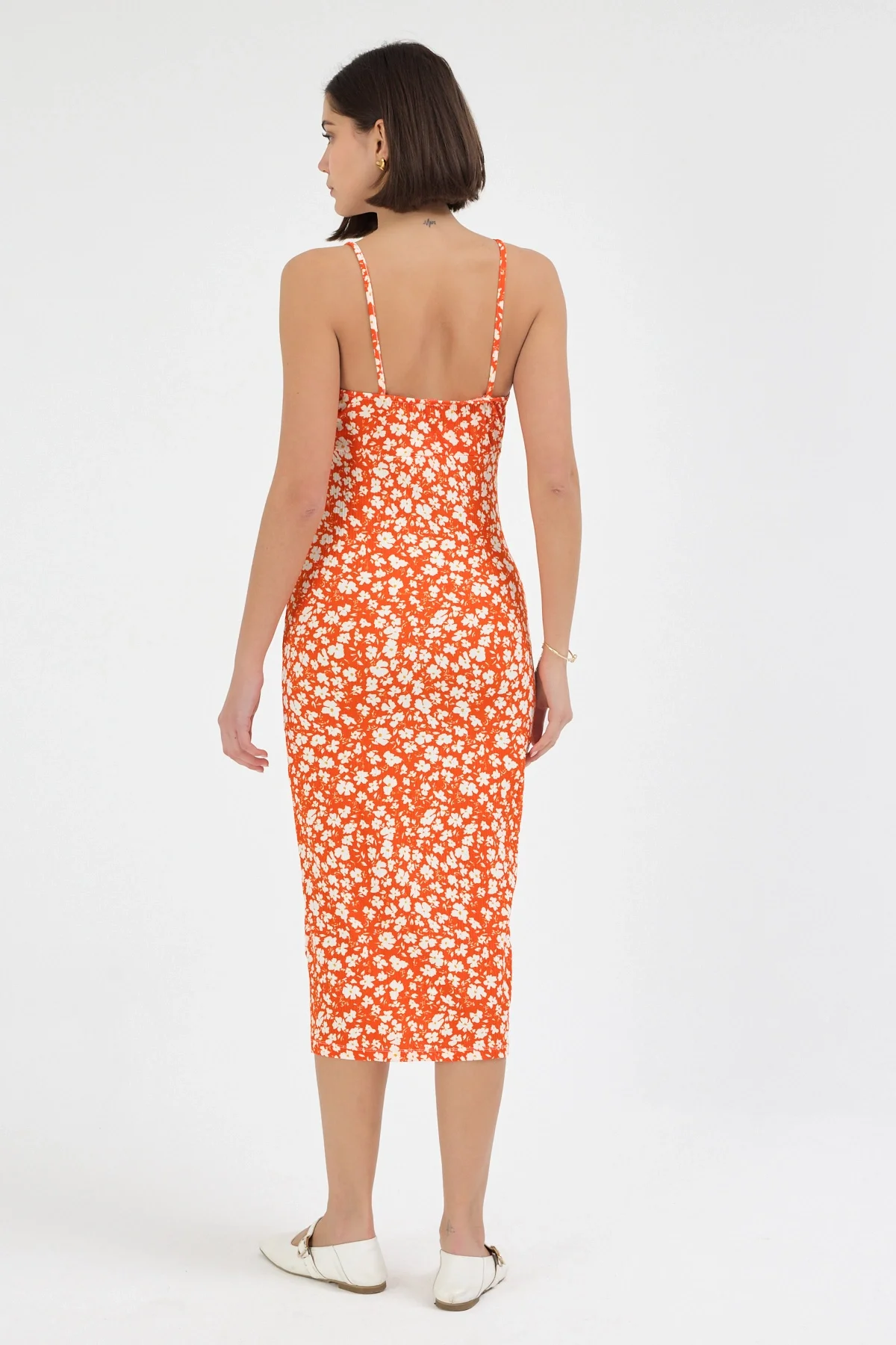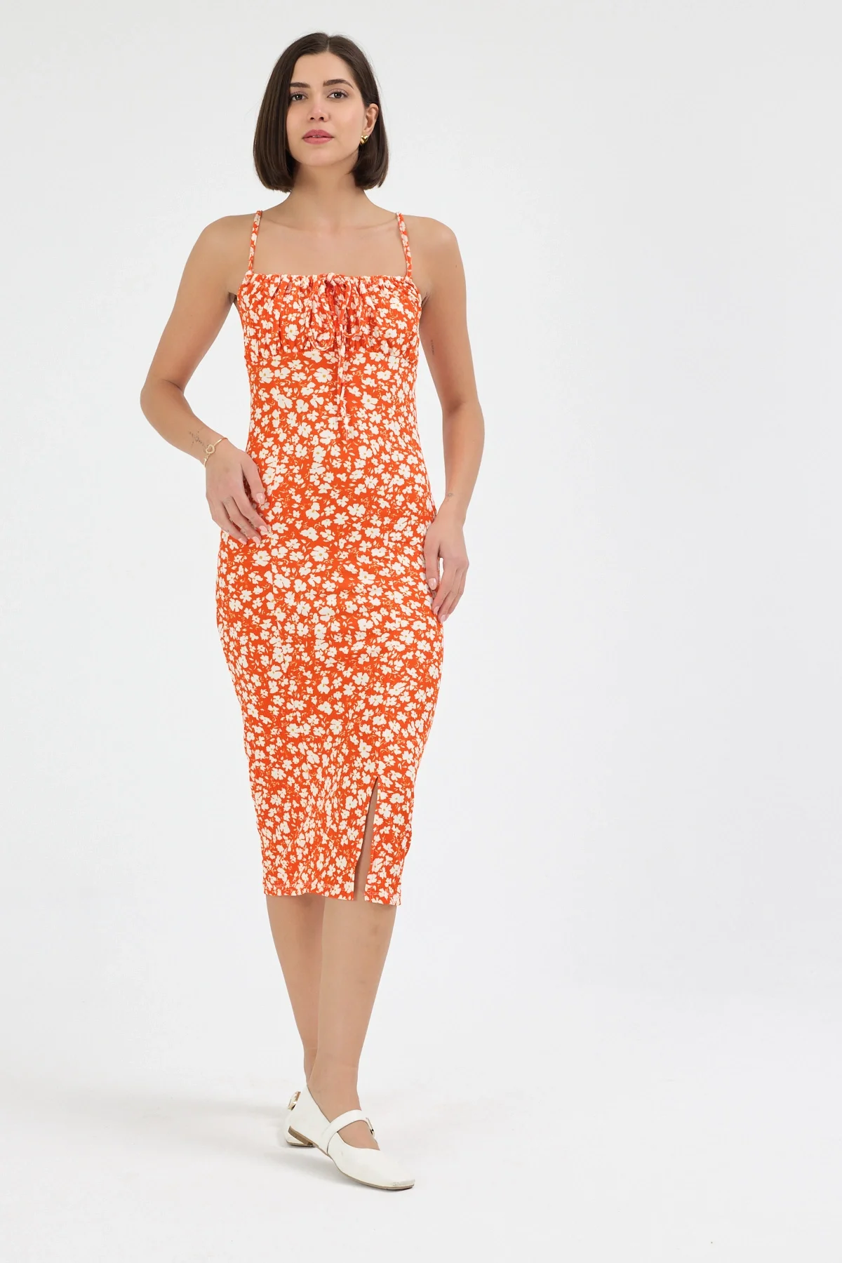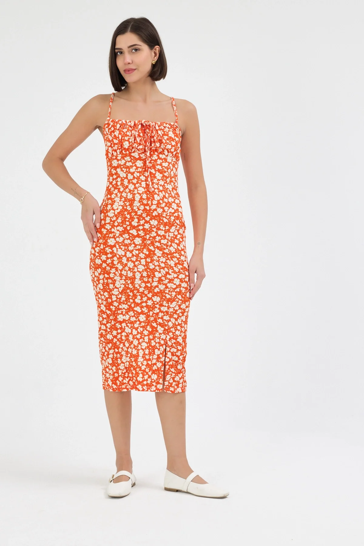 Turuncu çiçek desenli yazlık elbiseyi topuklu bir terlik ya da spor ayakkabı ile kombinleyerek taze bir görüntü yakalayabilirsin.