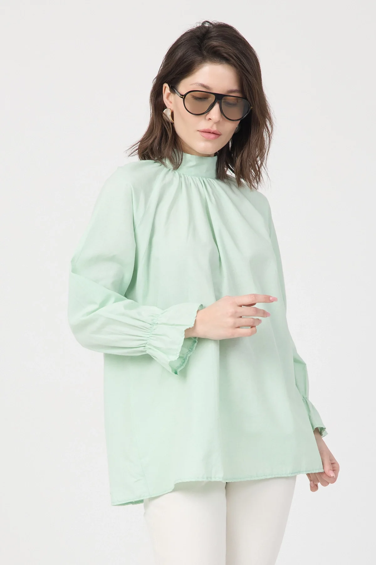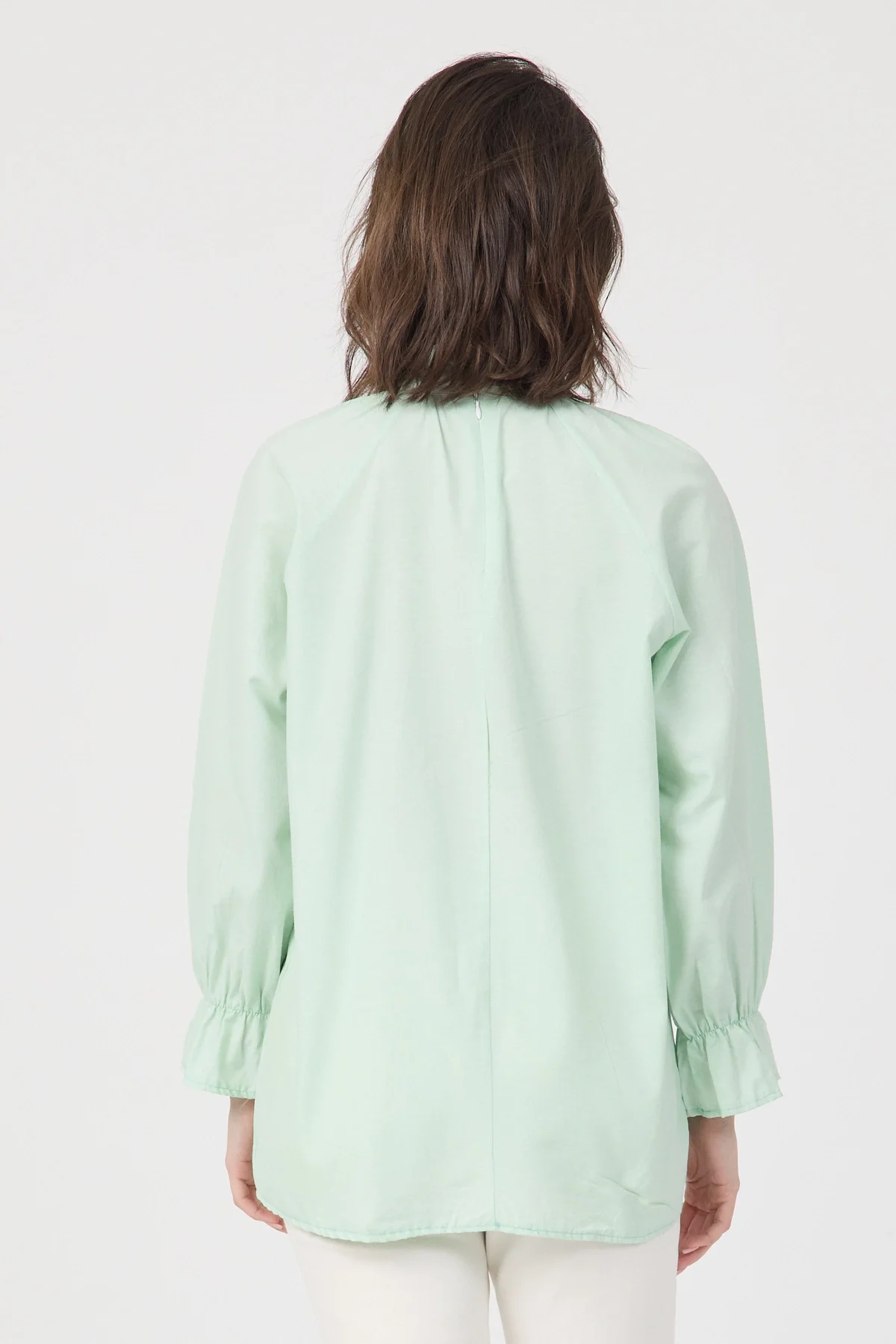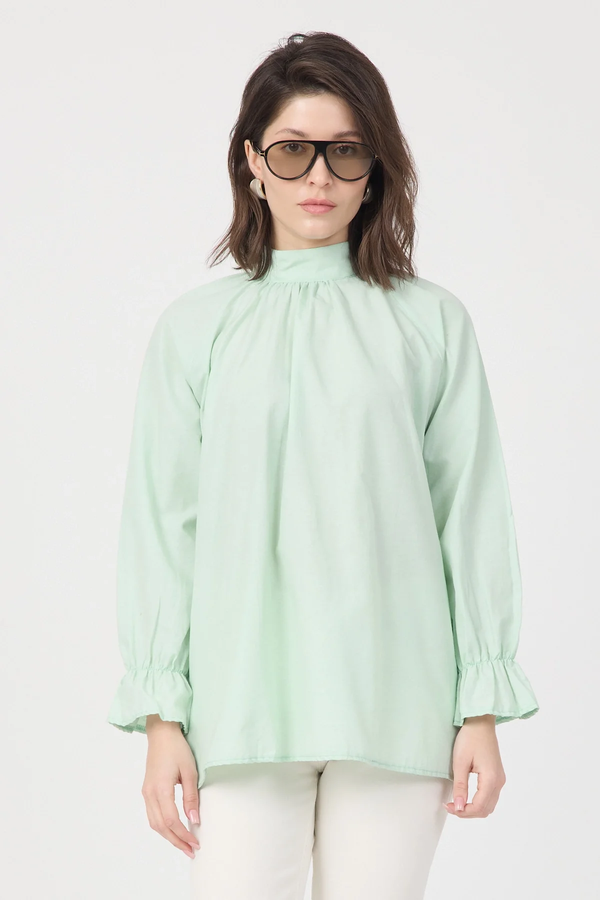Gardırobunuza sofistike bir dokunuş katacak bu yeşil bluz, hem ofis şıklığı hem de özel günleriniz için ideal bir seçenektir. Yüksek kaliteli poplin kumaşı sayesinde formunu koruyan ve nefes alan bir yapıya sahiptir. Modern dik yakası, göğüs kısmındaki zarif büzgü detayları ve kol ağızlarındaki şık volanlar ile feminen bir silüet çizer. Arkadan gizli fermuar kapanışı ile pratik bir kullanım sunan bu bluzu; kumaş pantolonlar, kalem etekler veya jeanler ile kombinleyerek zahmetsiz bir şıklık yakalayabilirsiniz.