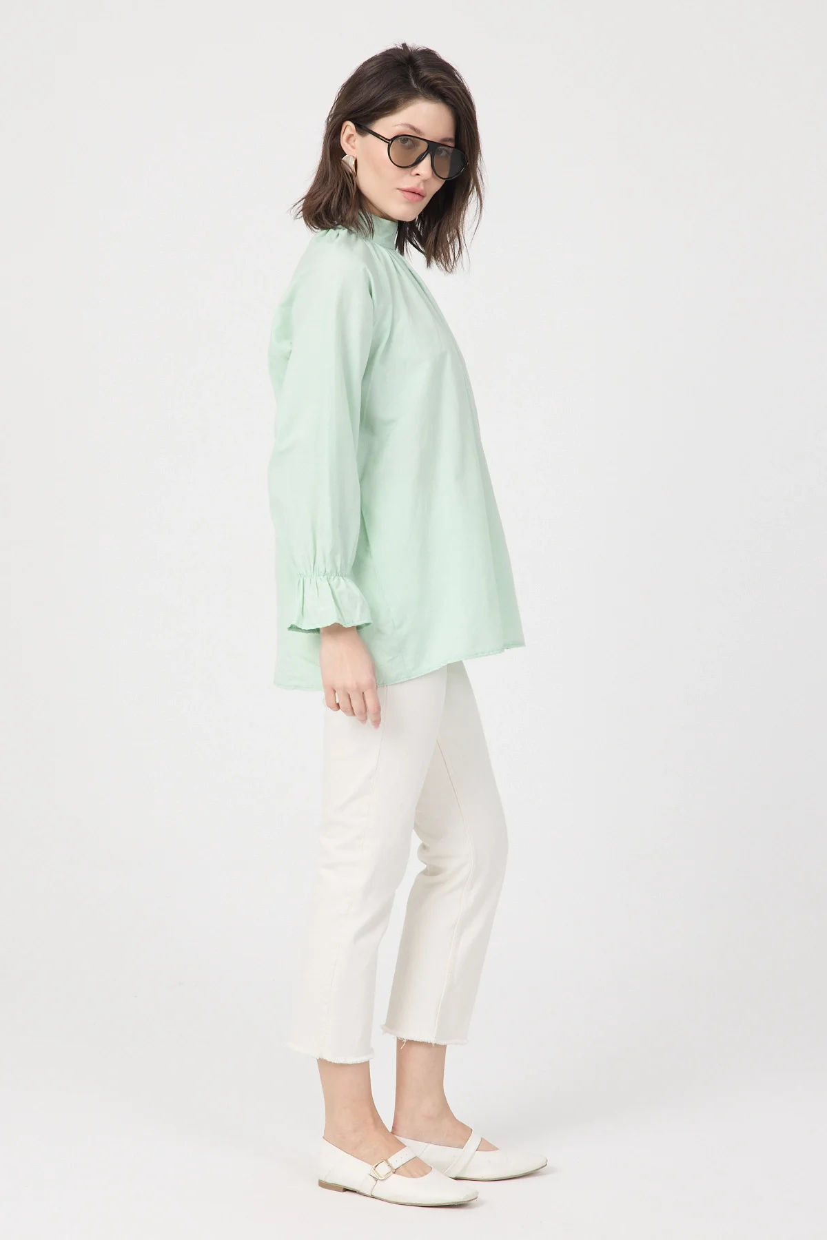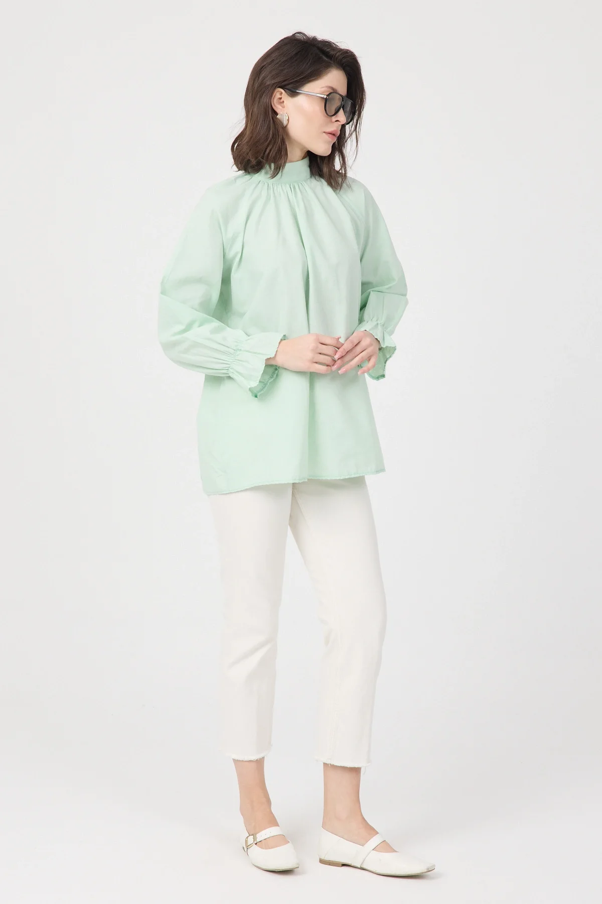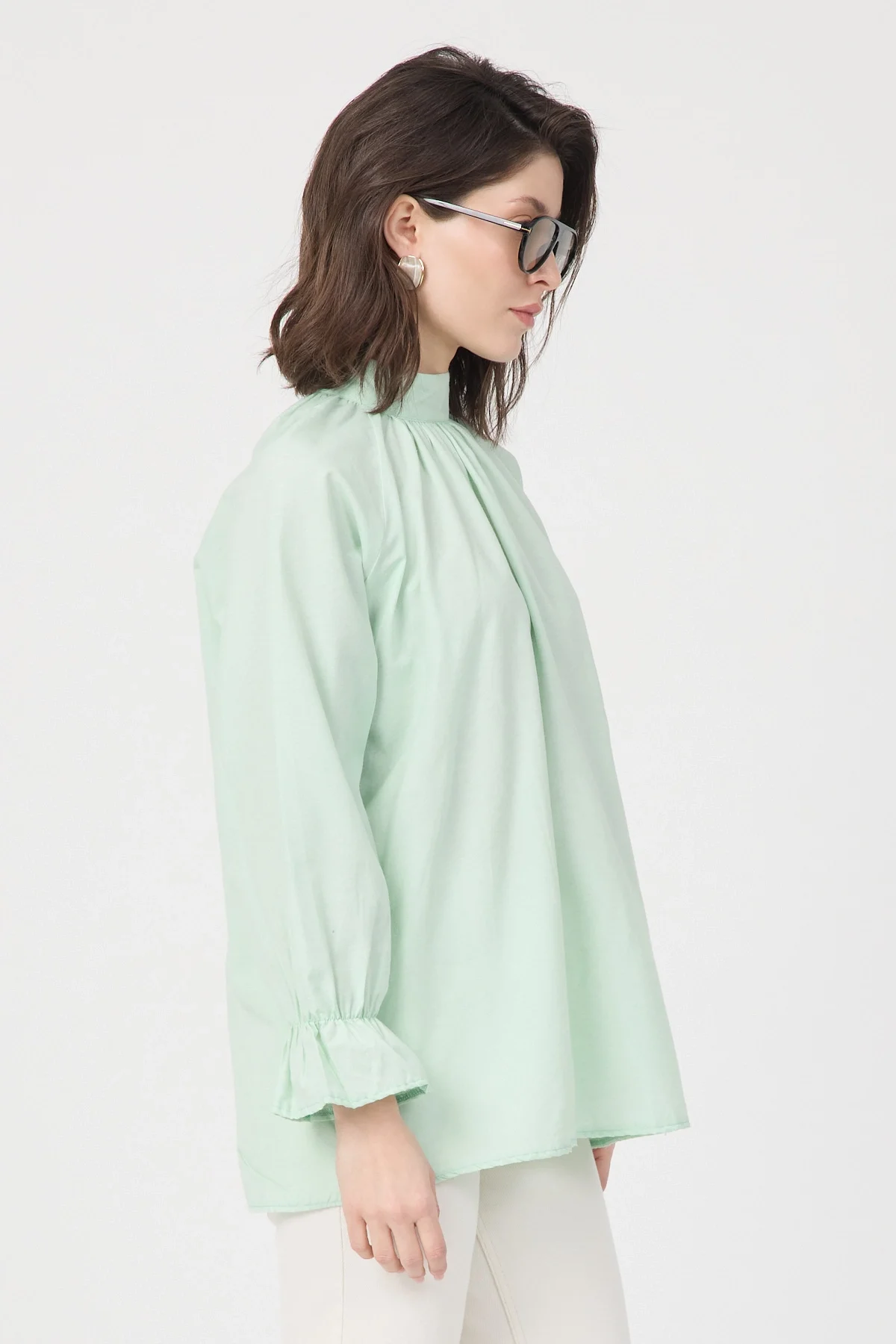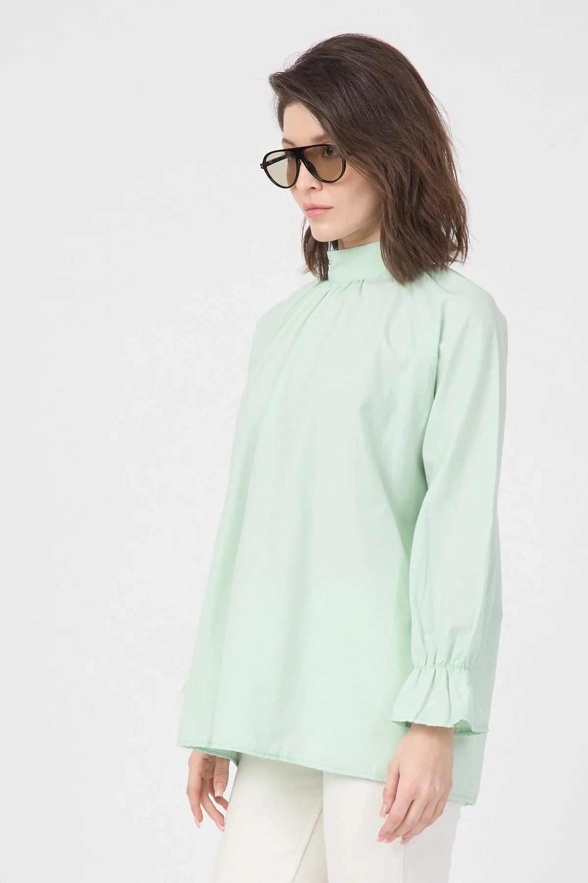 Gardırobunuza sofistike bir dokunuş katacak bu yeşil bluz, hem ofis şıklığı hem de özel günleriniz için ideal bir seçenektir. Yüksek kaliteli poplin kumaşı sayesinde formunu koruyan ve nefes alan bir yapıya sahiptir. Modern dik yakası, göğüs kısmındaki zarif büzgü detayları ve kol ağızlarındaki şık volanlar ile feminen bir silüet çizer. Arkadan gizli fermuar kapanışı ile pratik bir kullanım sunan bu bluzu; kumaş pantolonlar, kalem etekler veya jeanler ile kombinleyerek zahmetsiz bir şıklık yakalayabilirsiniz.