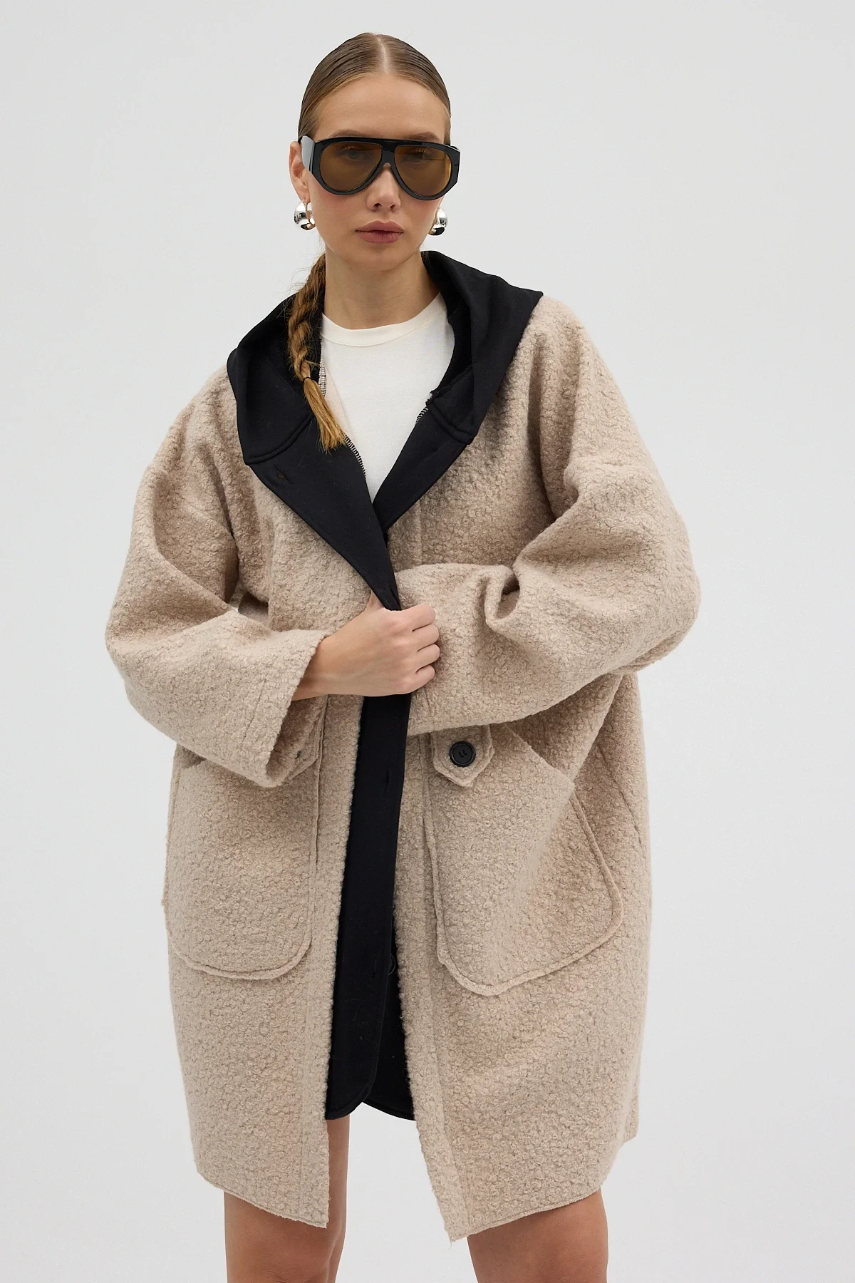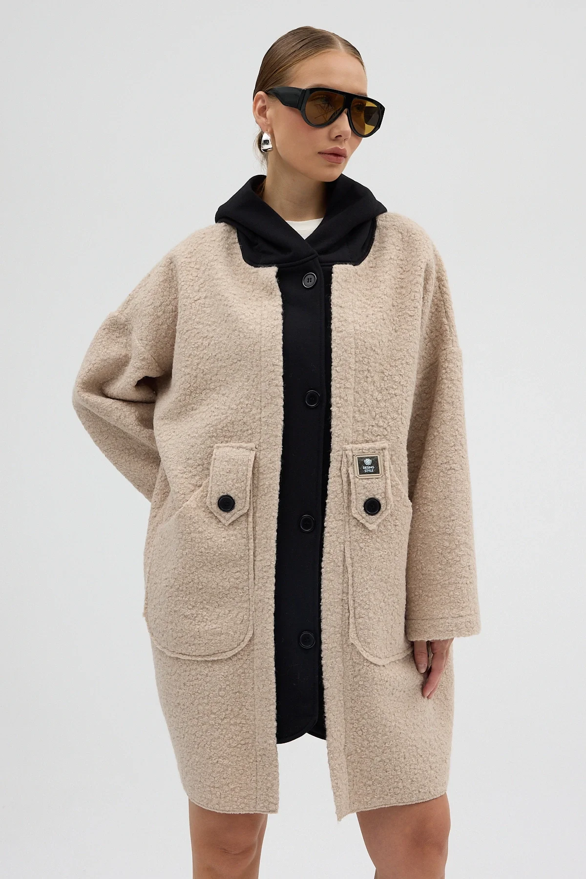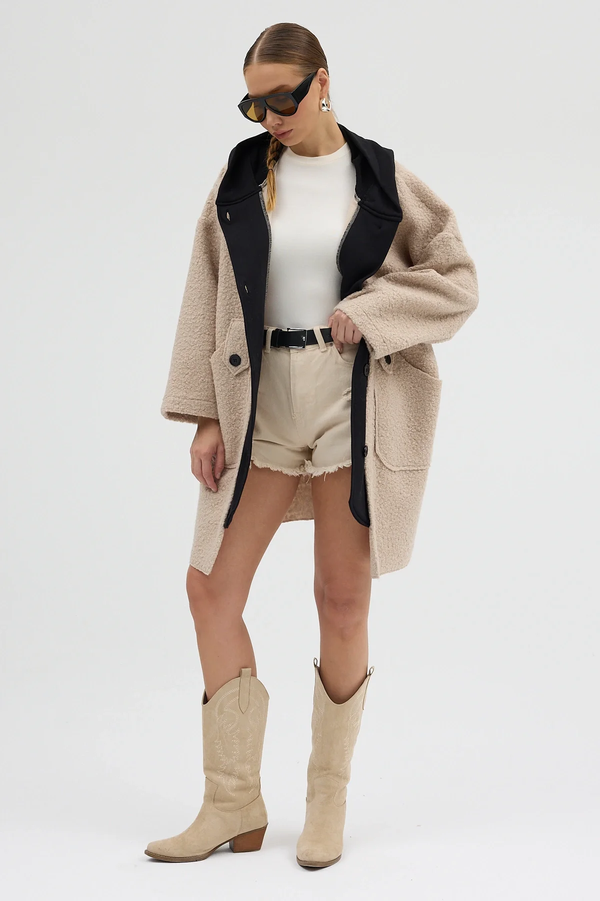 Kapüşonlu tasarımı ve çift cep detayıyla dikkat çeken bu kaşe kaban, düğmeli kapama sistemi ile zarafet ve kullanım kolaylığını bir araya getiriyor. Bej tonuyla her renkle uyum sağlayan klasik bir dış giyim parçası. Soğuk günlerde üstünüze alabileceğiniz hem şık hem sıcak tutan bir kaban alternatifi.