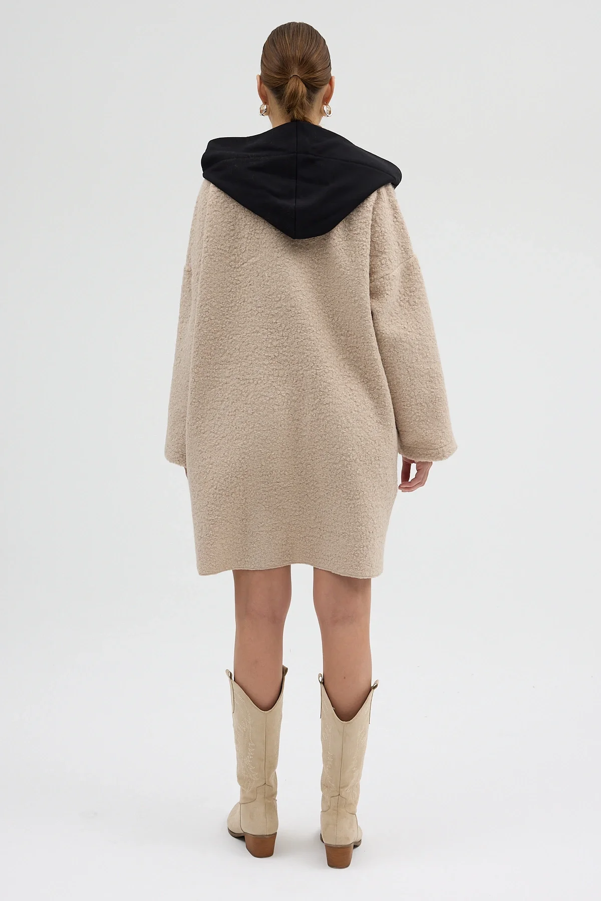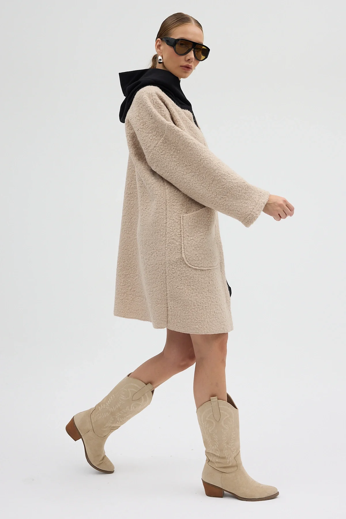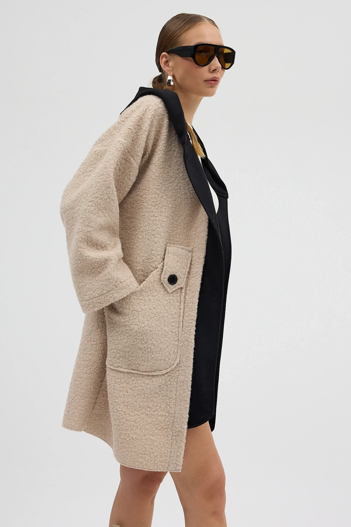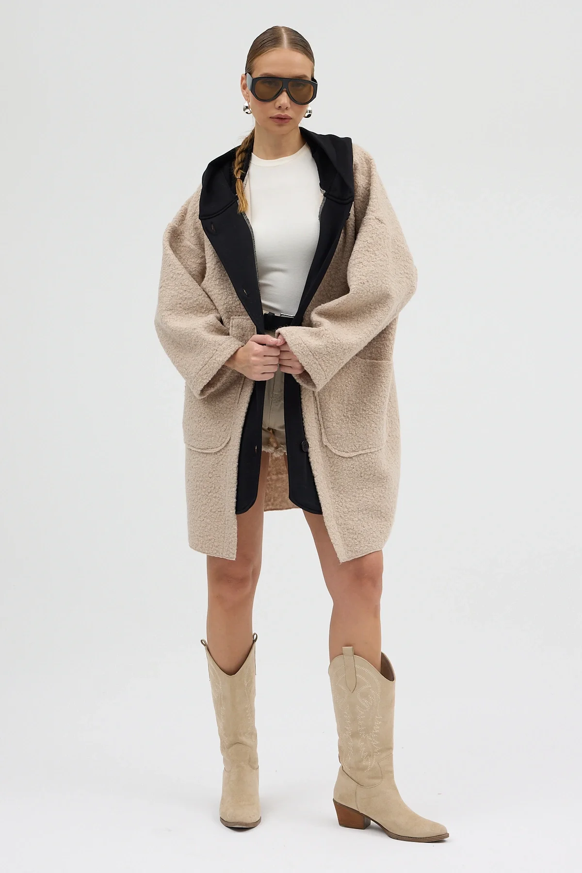 Kapüşonlu tasarımı ve çift cep detayıyla dikkat çeken bu kaşe kaban, düğmeli kapama sistemi ile zarafet ve kullanım kolaylığını bir araya getiriyor. Bej tonuyla her renkle uyum sağlayan klasik bir dış giyim parçası. Soğuk günlerde üstünüze alabileceğiniz hem şık hem sıcak tutan bir kaban alternatifi.