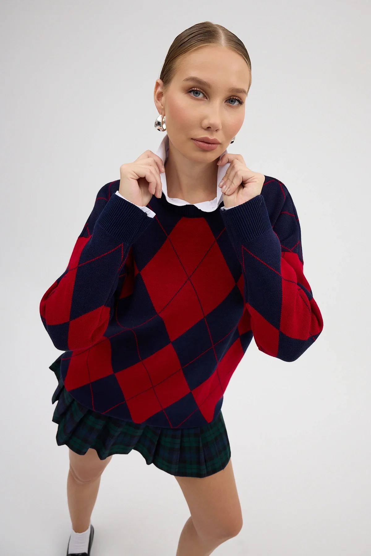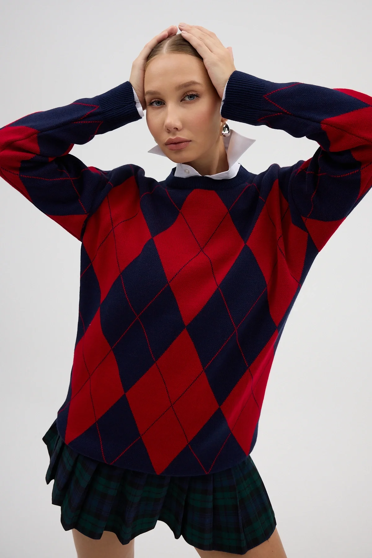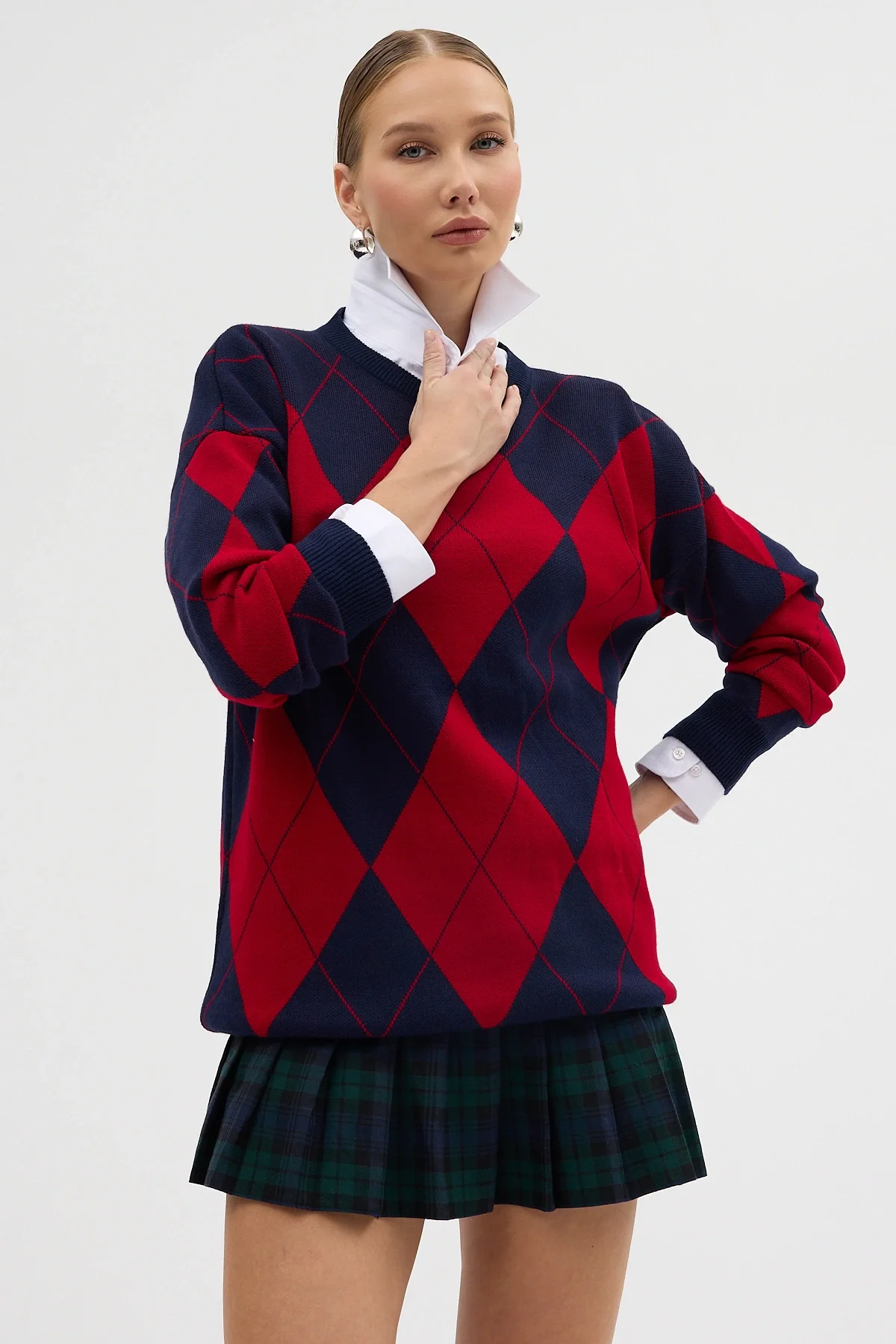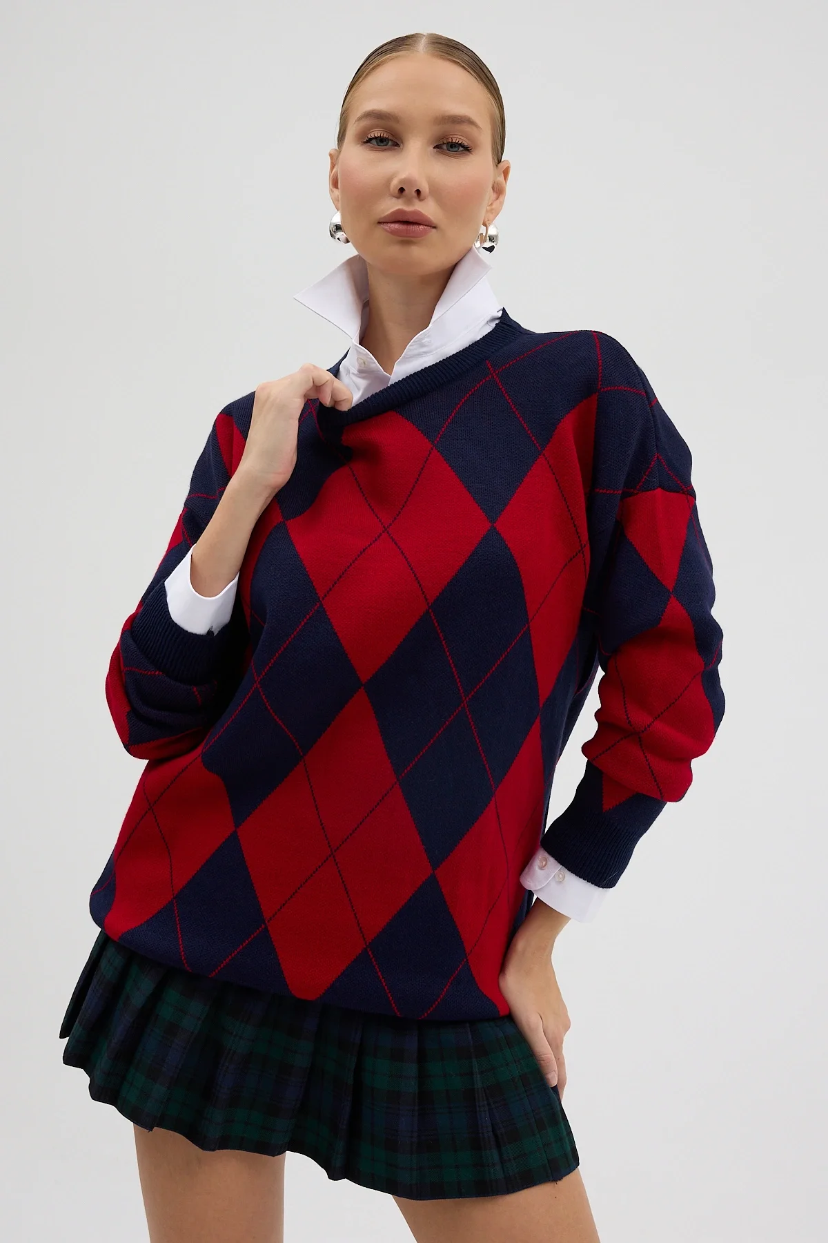 Modern ve klasik tarzı bir araya getiren bu baklava desenli triko kazak, yarım balıkçı yaka detayıyla şıklığı tamamlar. Oversize rahat kalıbı sayesinde konforlu bir kullanım sunar. Kalın dokulu yapısı soğuk havalarda sıcak tutarken, kırmızı-lacivert renk geçişleriyle dikkat çeken bir görünüm oluşturur.