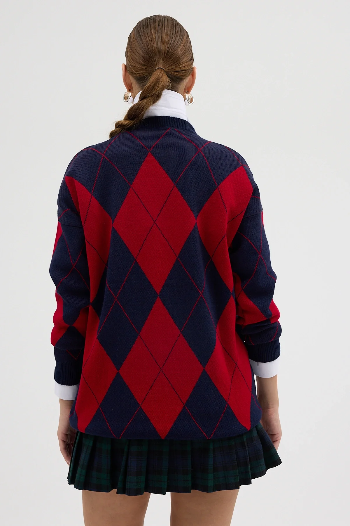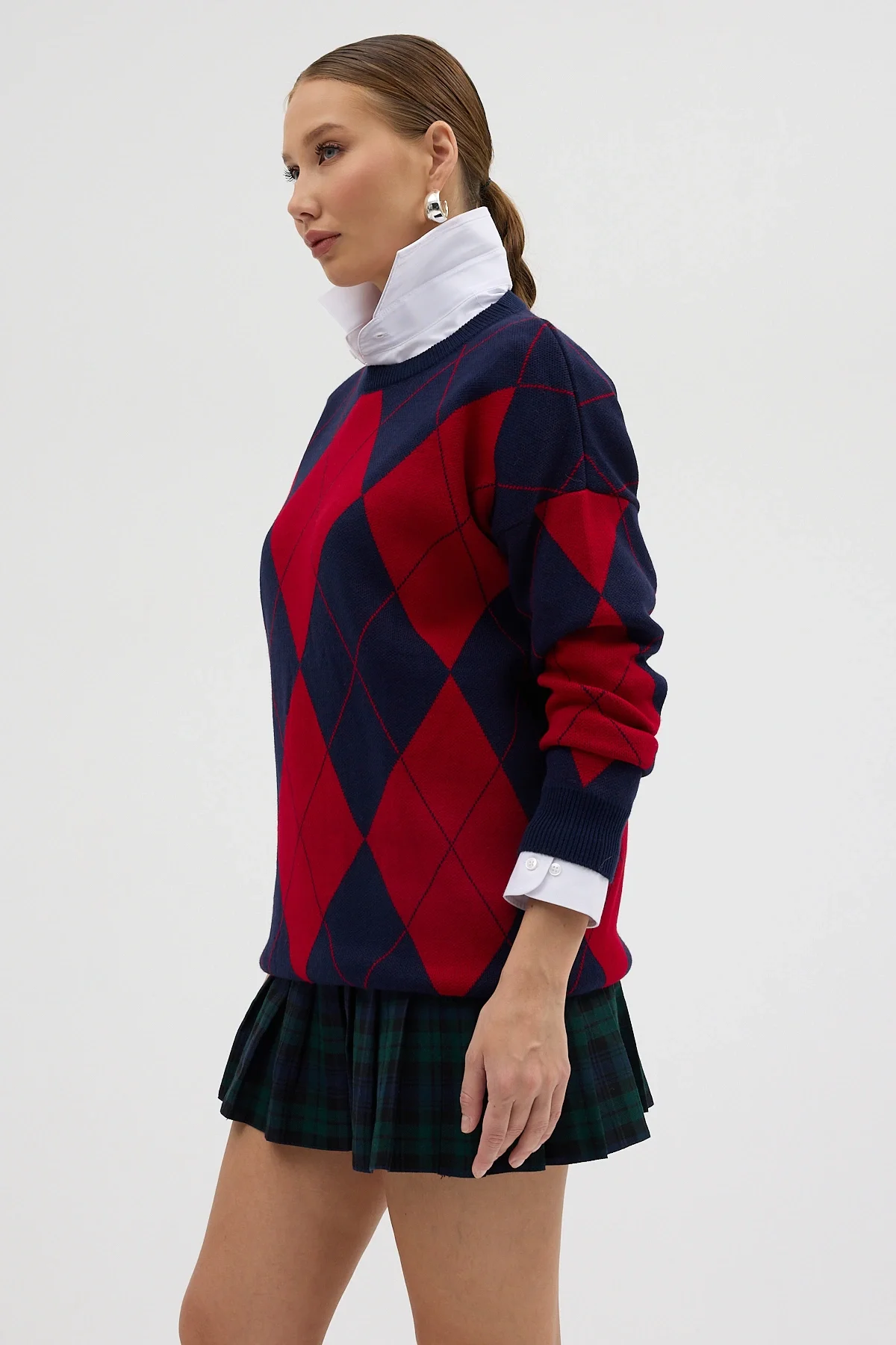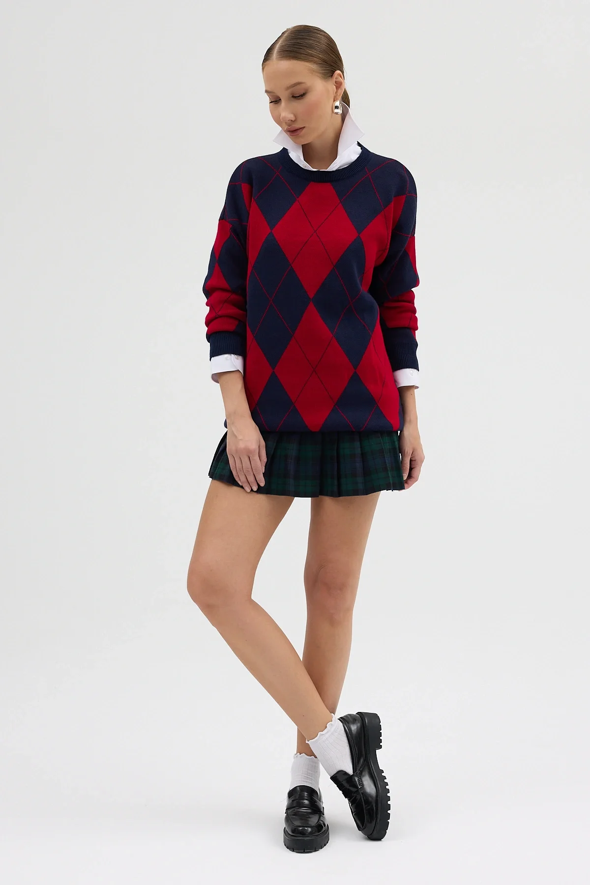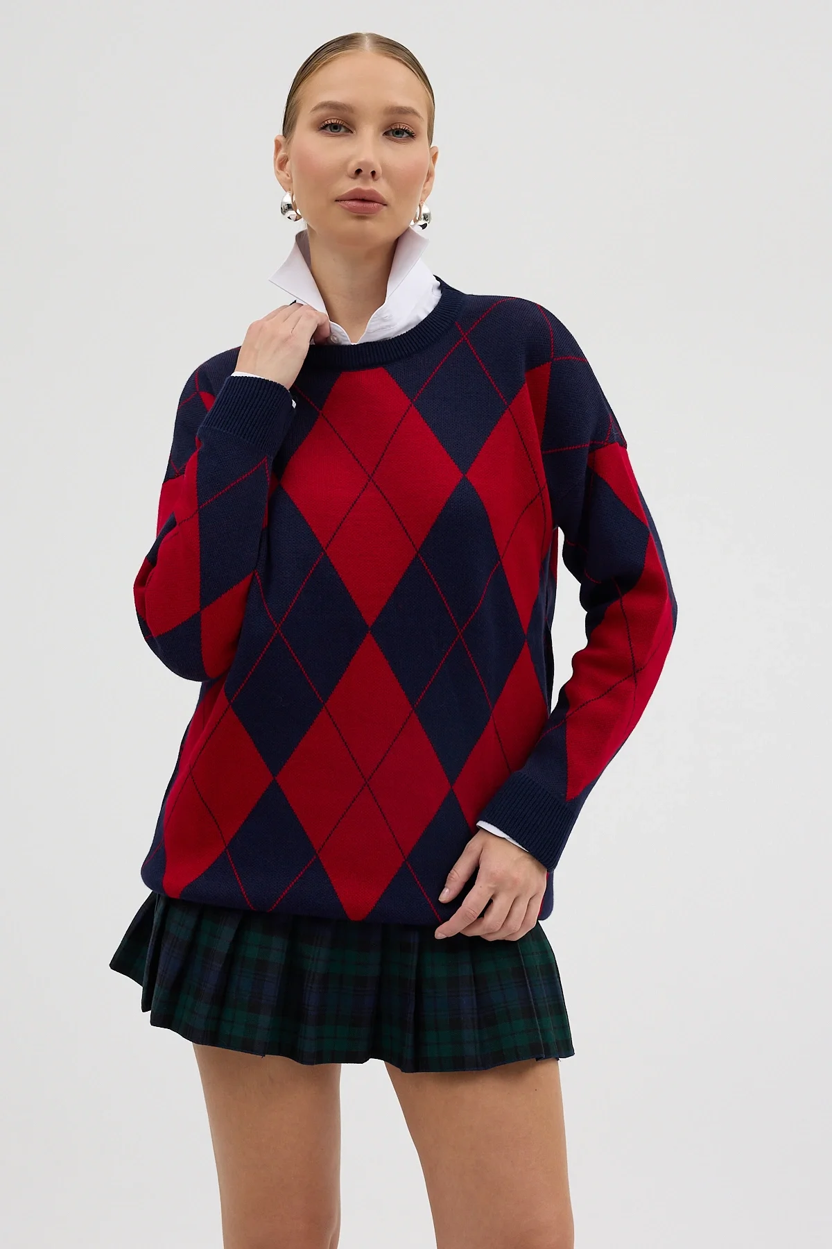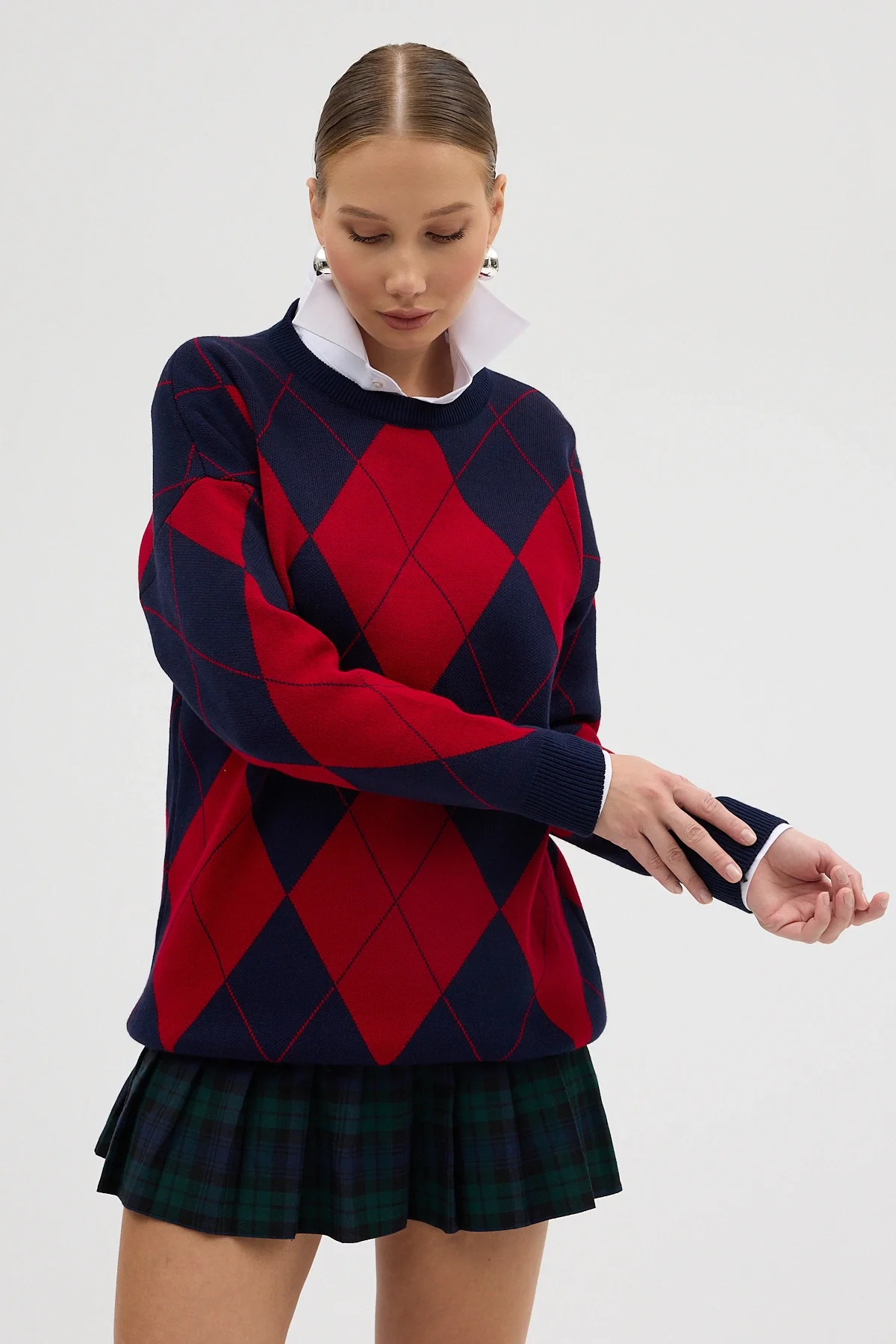 Modern ve klasik tarzı bir araya getiren bu baklava desenli triko kazak, yarım balıkçı yaka detayıyla şıklığı tamamlar. Oversize rahat kalıbı sayesinde konforlu bir kullanım sunar. Kalın dokulu yapısı soğuk havalarda sıcak tutarken, kırmızı-lacivert renk geçişleriyle dikkat çeken bir görünüm oluşturur.